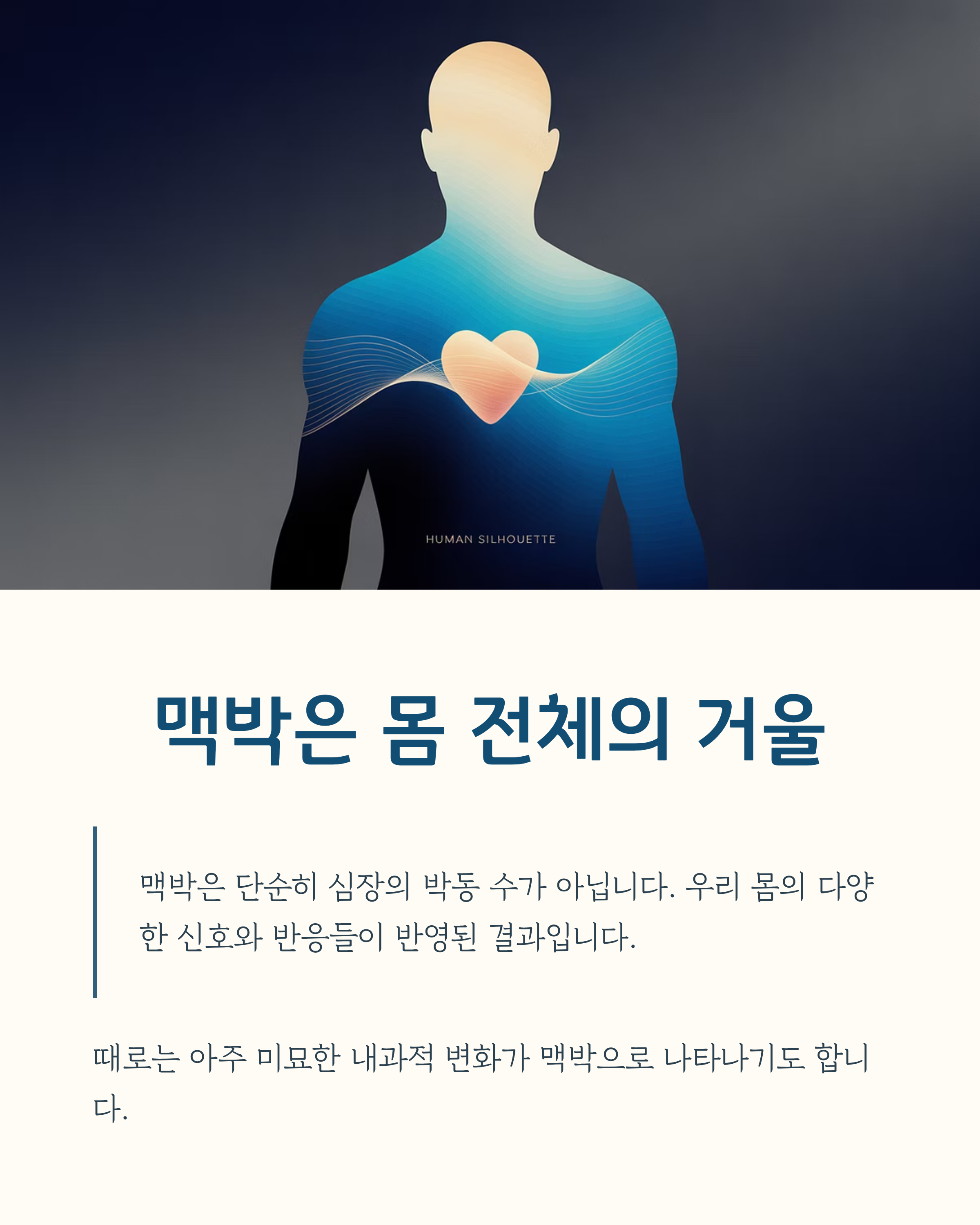 우리 몸의 다양한 신호와 반응들이 반영된 결과이기 때문에, 맥박의 변화는 신체 전체의 상태를 보여주는 거울과도 같습니다.