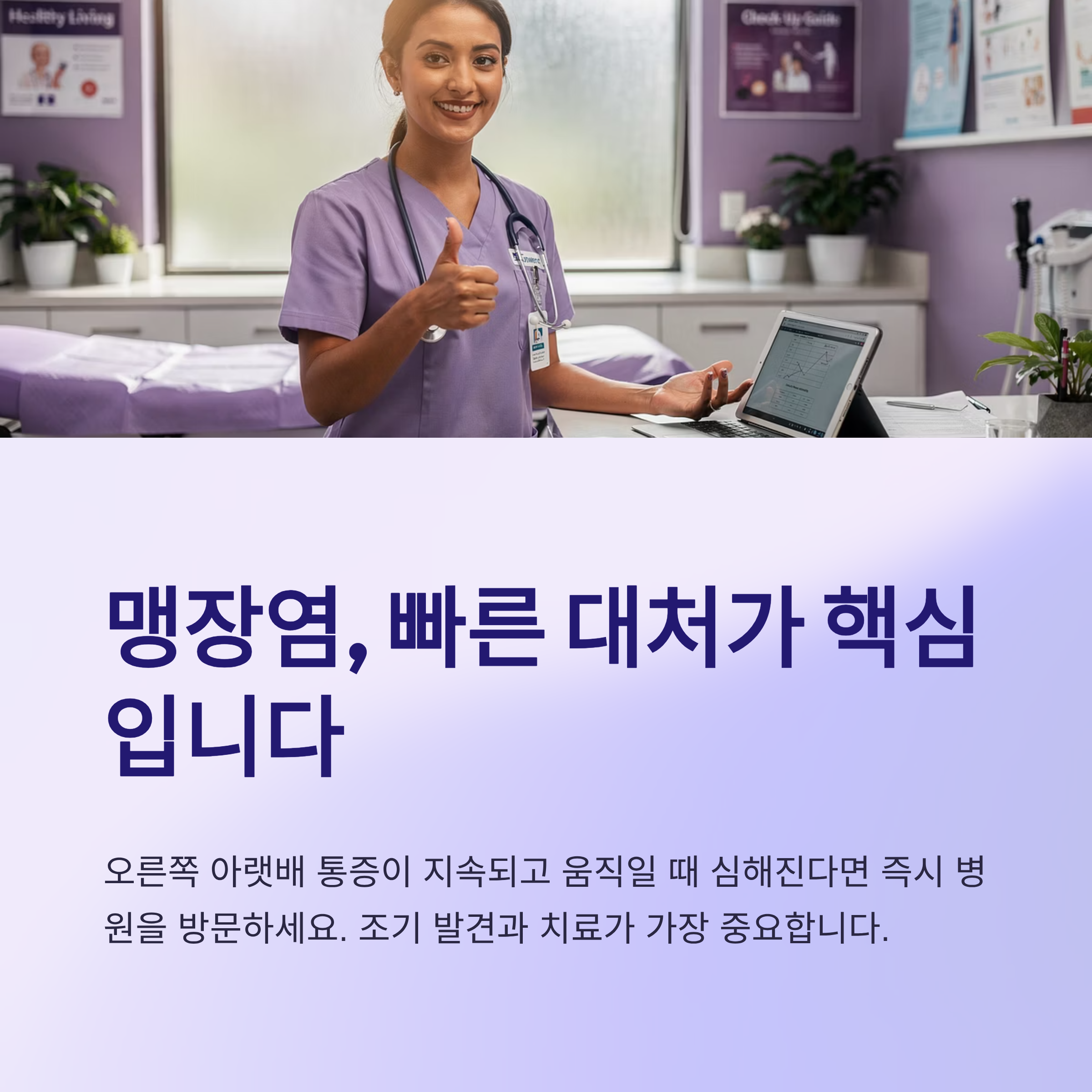 맹장염은 우리 주변에서 흔히 발생하는 급성 질환 중 하나지만, 초기증상이 다른 복통과 비슷해서 자칫 지나치기 쉽습니다. 특히 오른쪽 아랫배 통증이 대표적인 특징인데요. 단순한 배탈이나 소화불량으로 착각하지 않도록, 맹장염의 초기 증상과 통증의 위치, 진행 과정 등을 자세히 정리해드립니다.