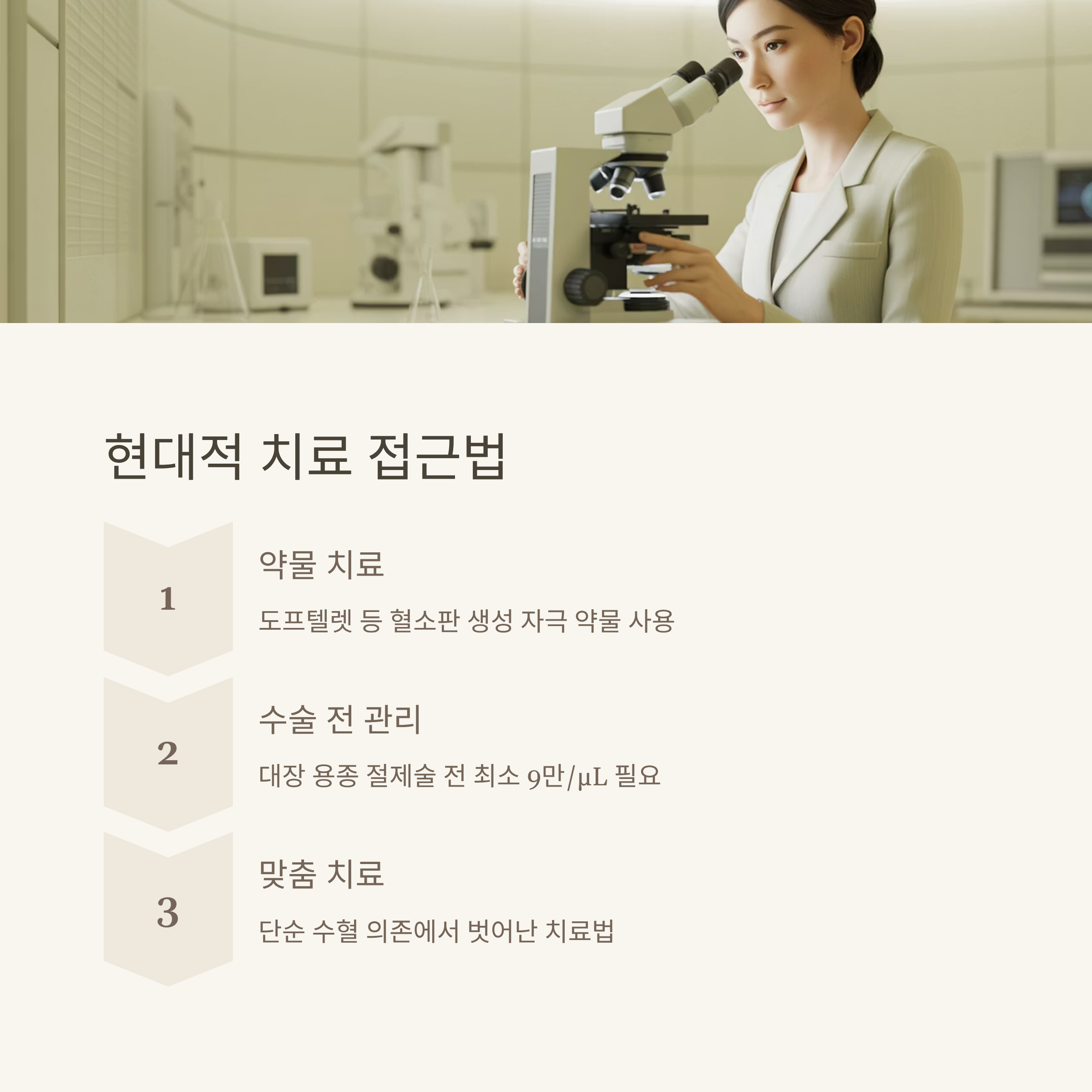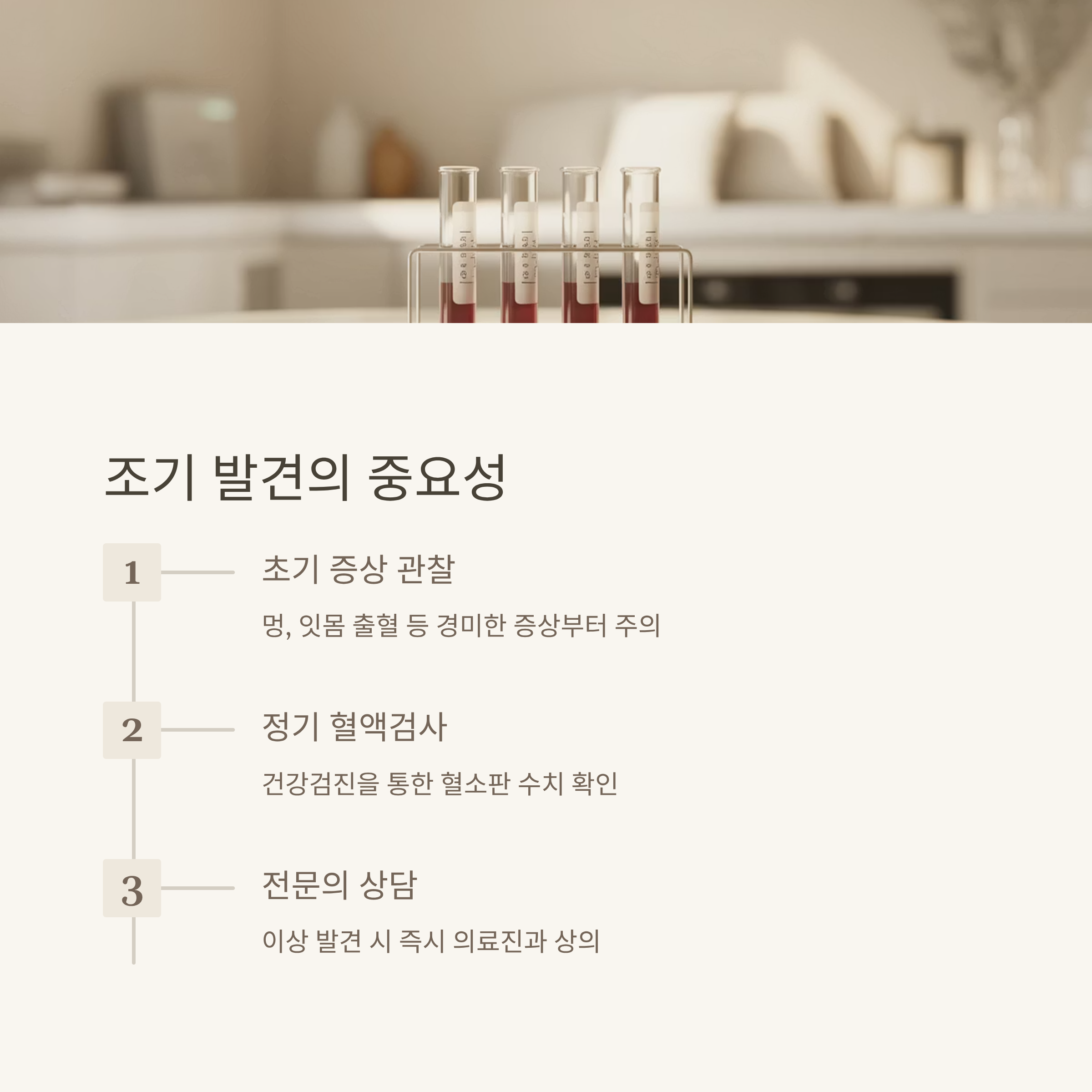 정기적인 건강검진을 통해 혈소판 수치를 확인하고, 이상이 있을 때는 전문 의료진과 상의해 조기에 치료를 시작하는 것이 가장 중요합니다.