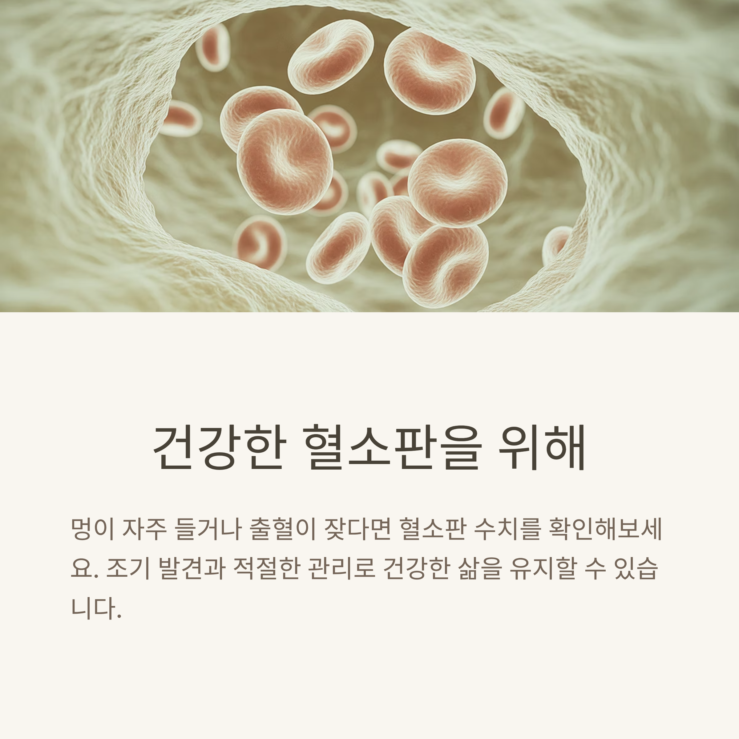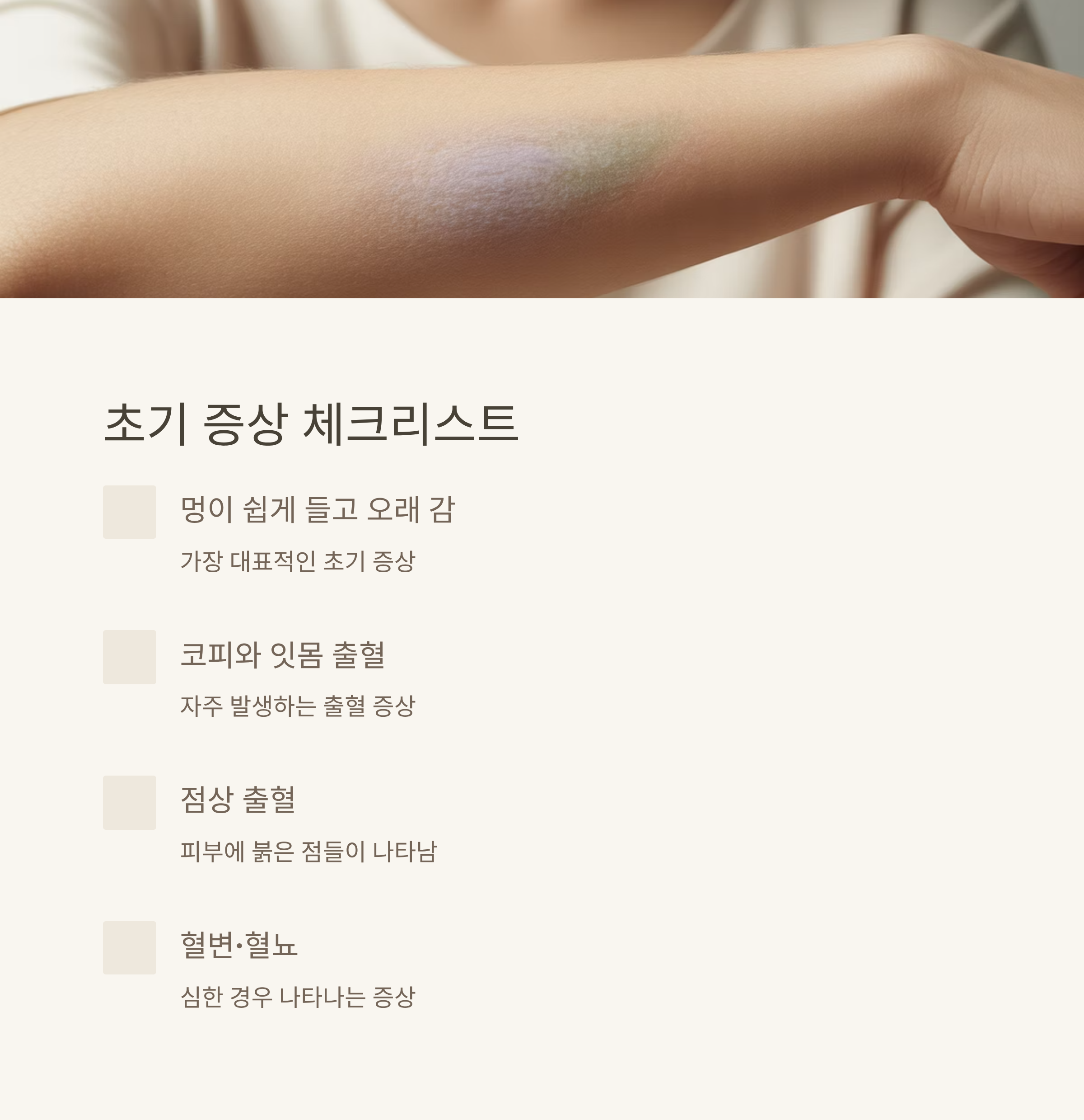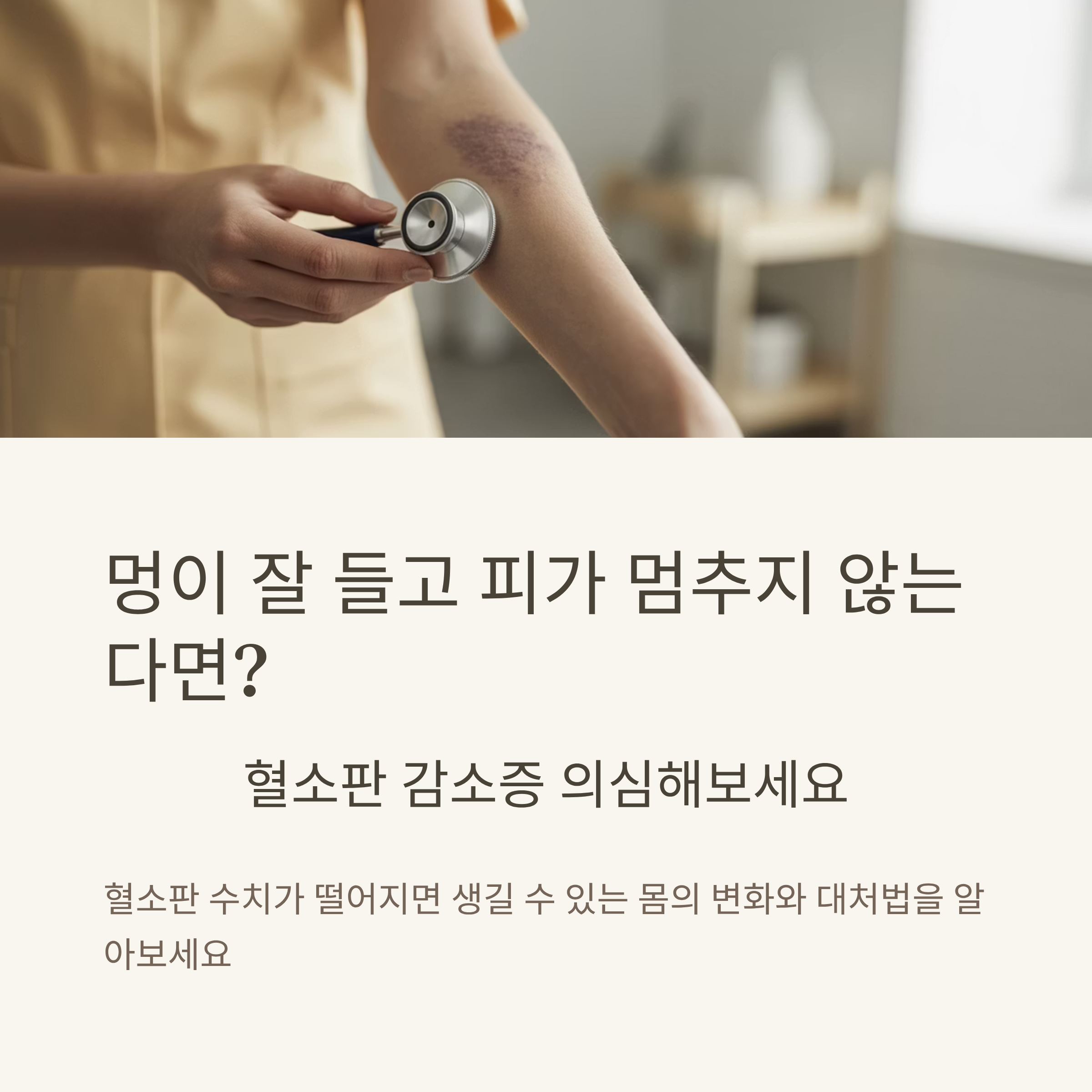 혈소판 감소증은 초기에 특별한 증상이 없거나 경미하게 시작되기 때문에 자칫 간과되기 쉽습니다. 하지만 멍이 자주 들거나 잇몸 출혈이 반복된다면 꼭 혈액검사를 받아보세요.