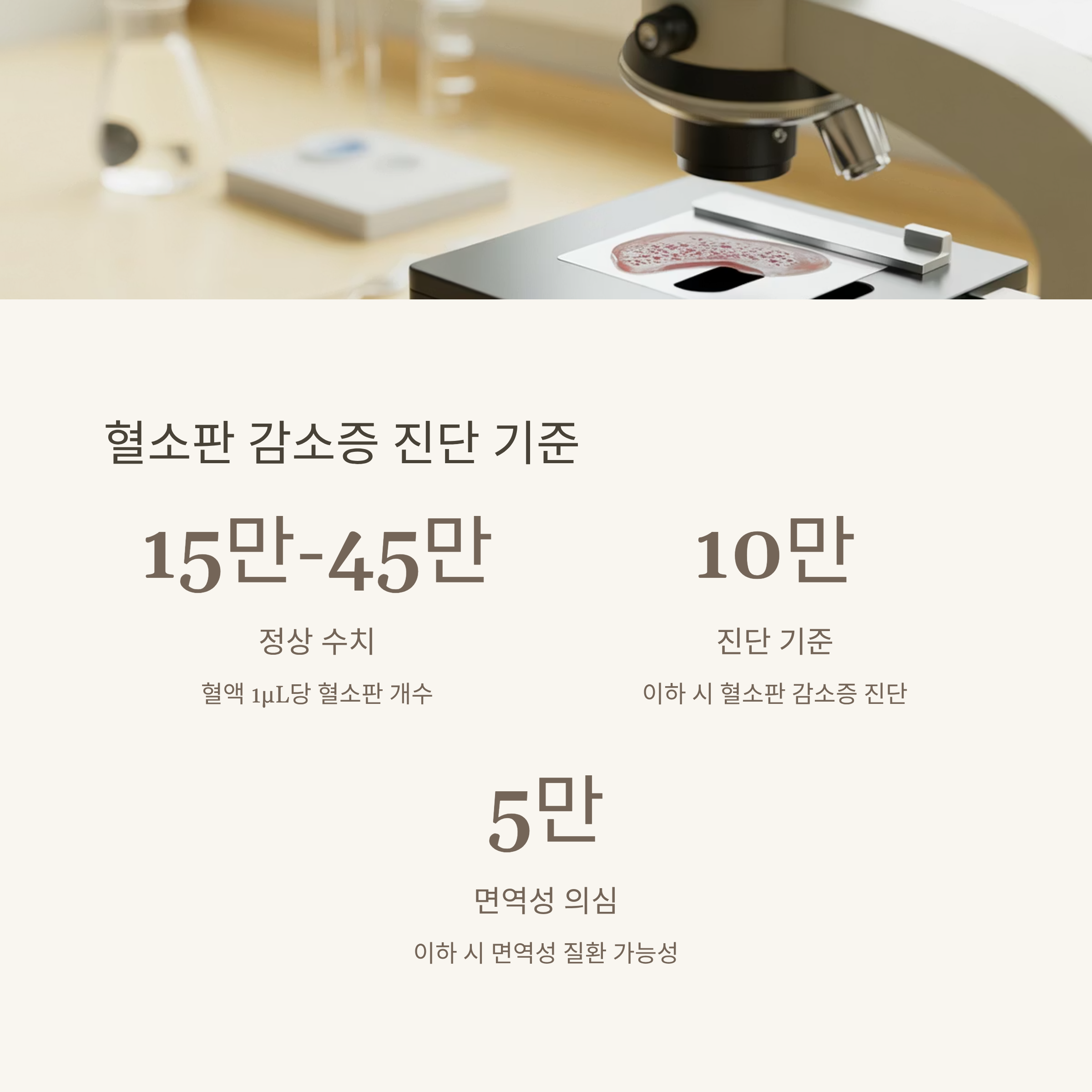 혈소판 감소증은 혈액 속 혈소판 수가 정상 수치(15만~45만/μL)보다 낮아지는 상태를 말합니다. 일반적으로 10만/μL 이하이면 혈소판 감소증으로 진단되며, 특히 5만/μL 이하라면 면역성 혈소판감소증 가능성도 배제할 수 없습니다.