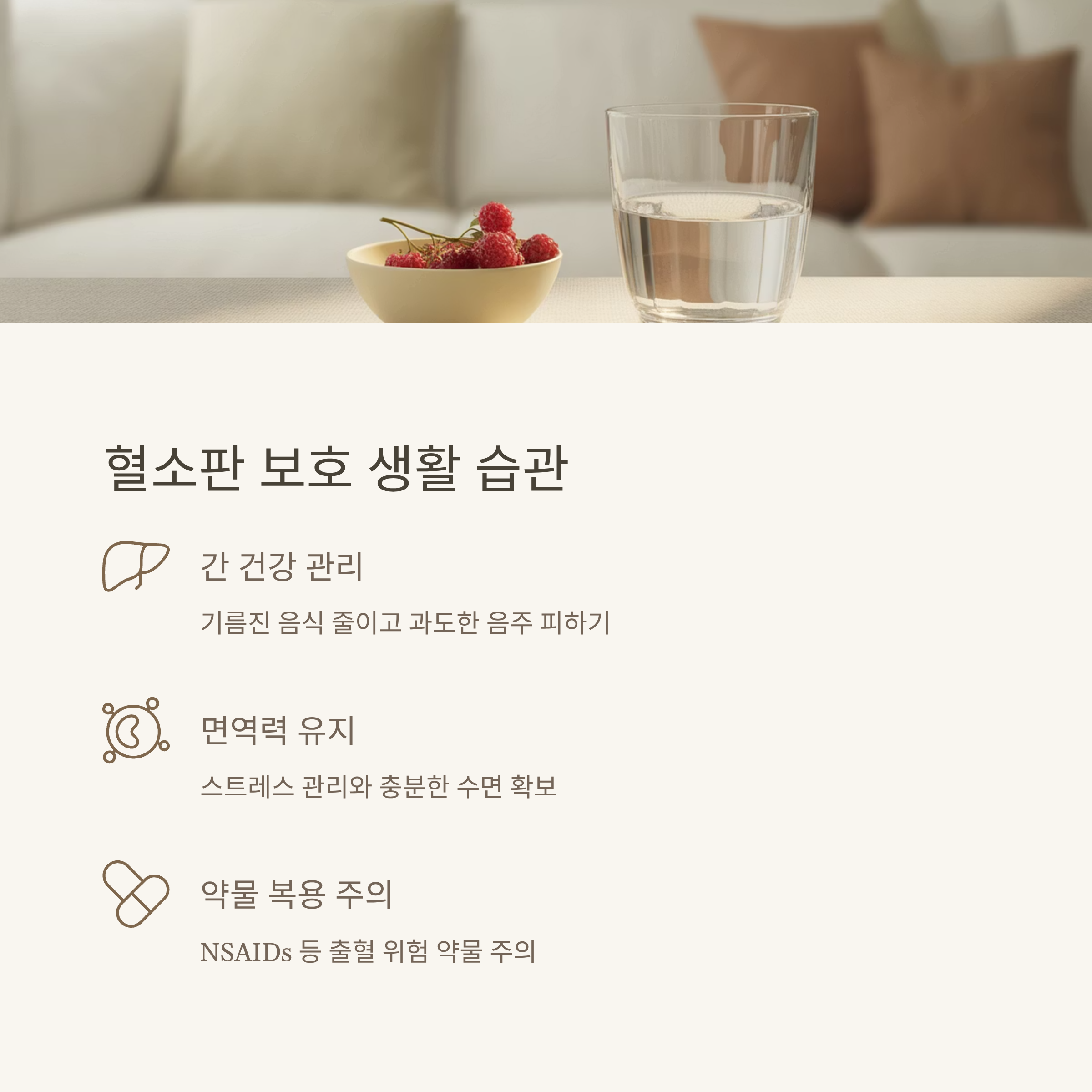 혈소판을 보호하기 위한 생활 습관도 중요한 부분입니다. 무리한 음주나 약물 복용은 피하고, 간 건강을 지키는 식습관을 유지하는 것이 도움됩니다. 또 면역력 저하로 인해 증상이 악화될 수 있으니 스트레스 관리와 규칙적인 수면도 필요합니다.