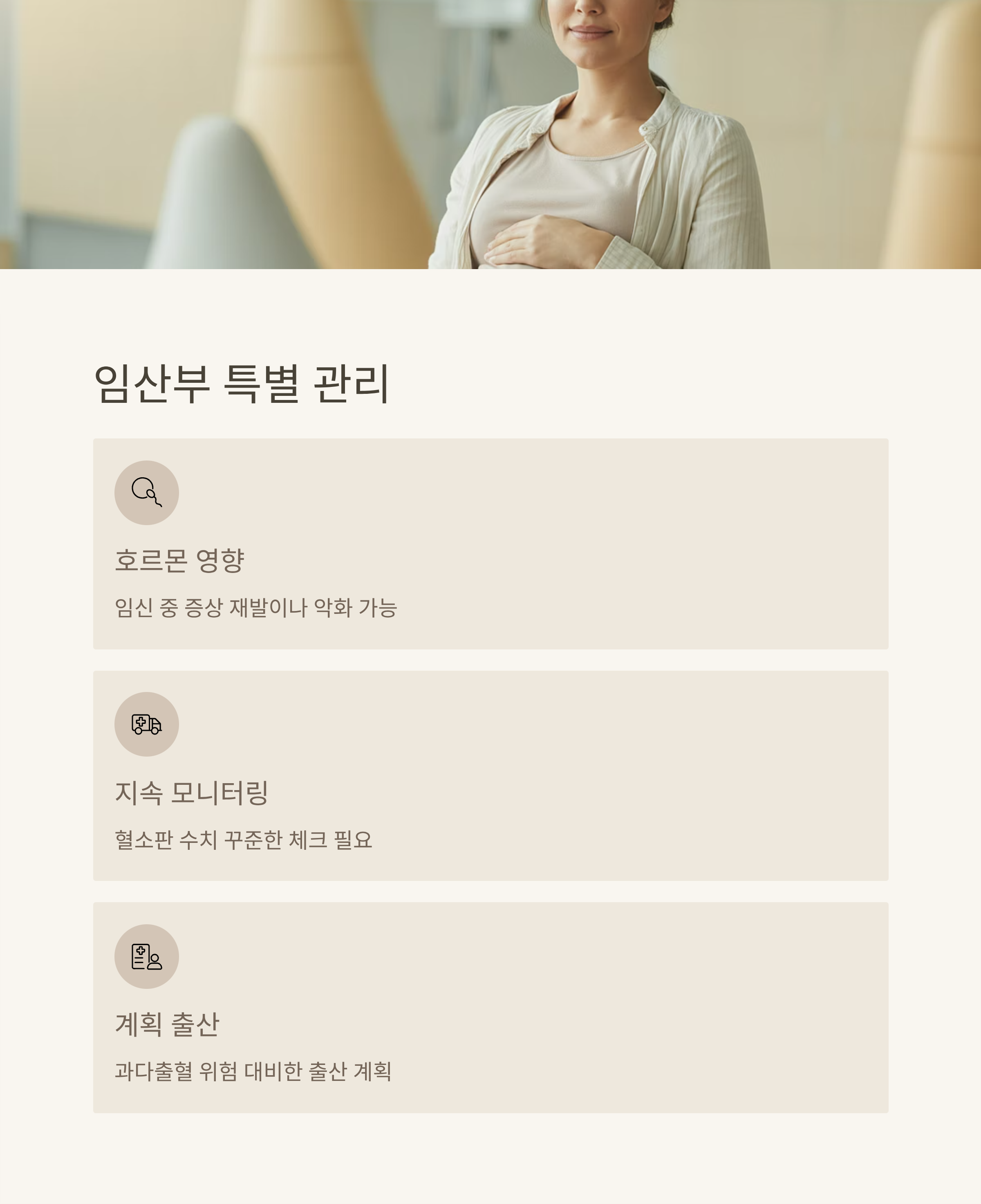 산모의 경우 혈소판 수치를 꾸준히 체크하고, 출혈 가능성에 대비한 계획 출산이 중요합니다.