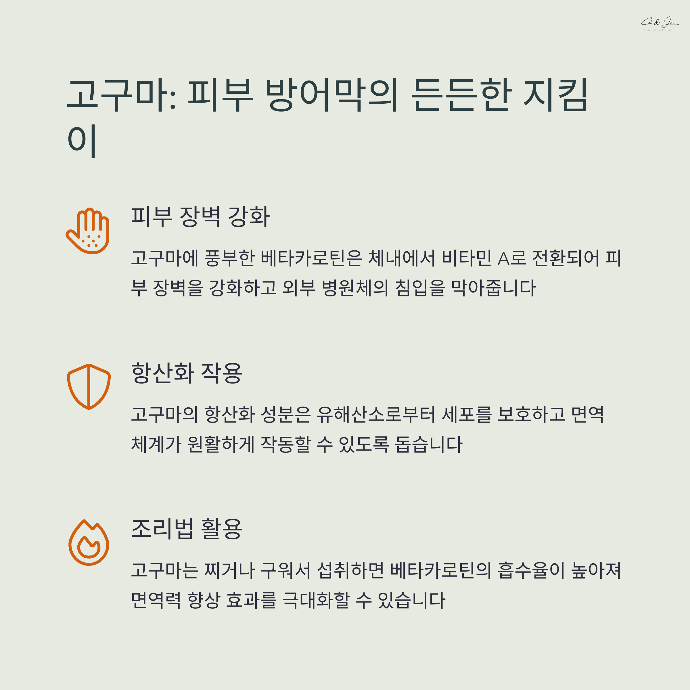 | 알리신 성분이 면역세포 활동을 높여줍니다. | 베타카로틴이 피부 장벽을 튼튼하게 해줍니다. | 장 건강을 통해 면역력 70% 이상을 유지합니다. |