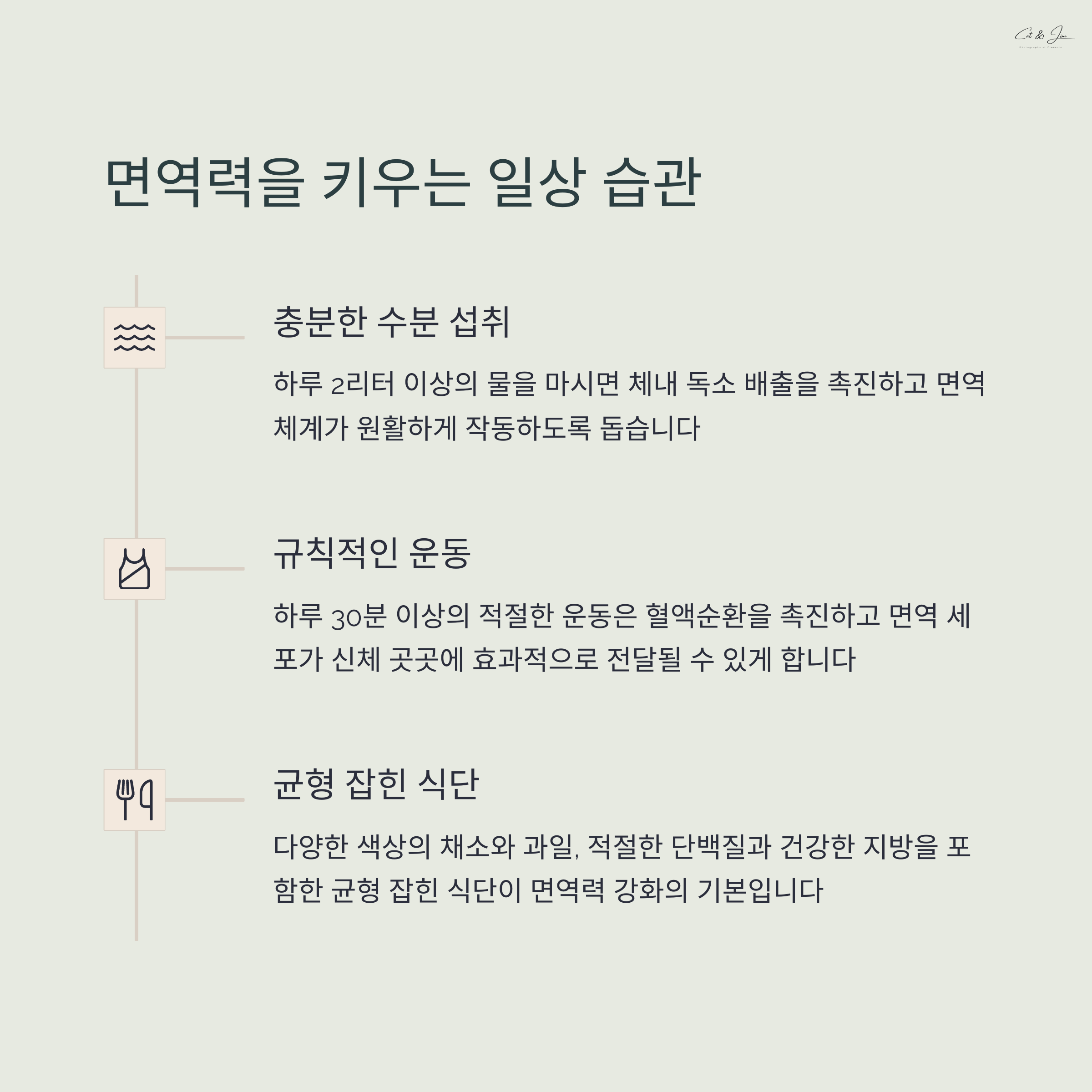 이러한 음식 외에도 표고버섯, 견과류, 홍삼 등의 건강식품은 각각 베타글루칸, 비타민E, 진세노사이드 등 면역력 향상에 도움을 주는 성분을 포함하고 있습니다. 또한 충분한 수분 섭취, 균형 잡힌 식단, 규칙적인 운동을 함께 실천한다면 몸 전체의 면역 시스템을 더욱 탄탄하게 만들 수 있습니다. 면역력을 위한 일상적인 실천은 생각보다 어렵지 않습니다. 지금부터 한 가지씩 실천해 보세요.