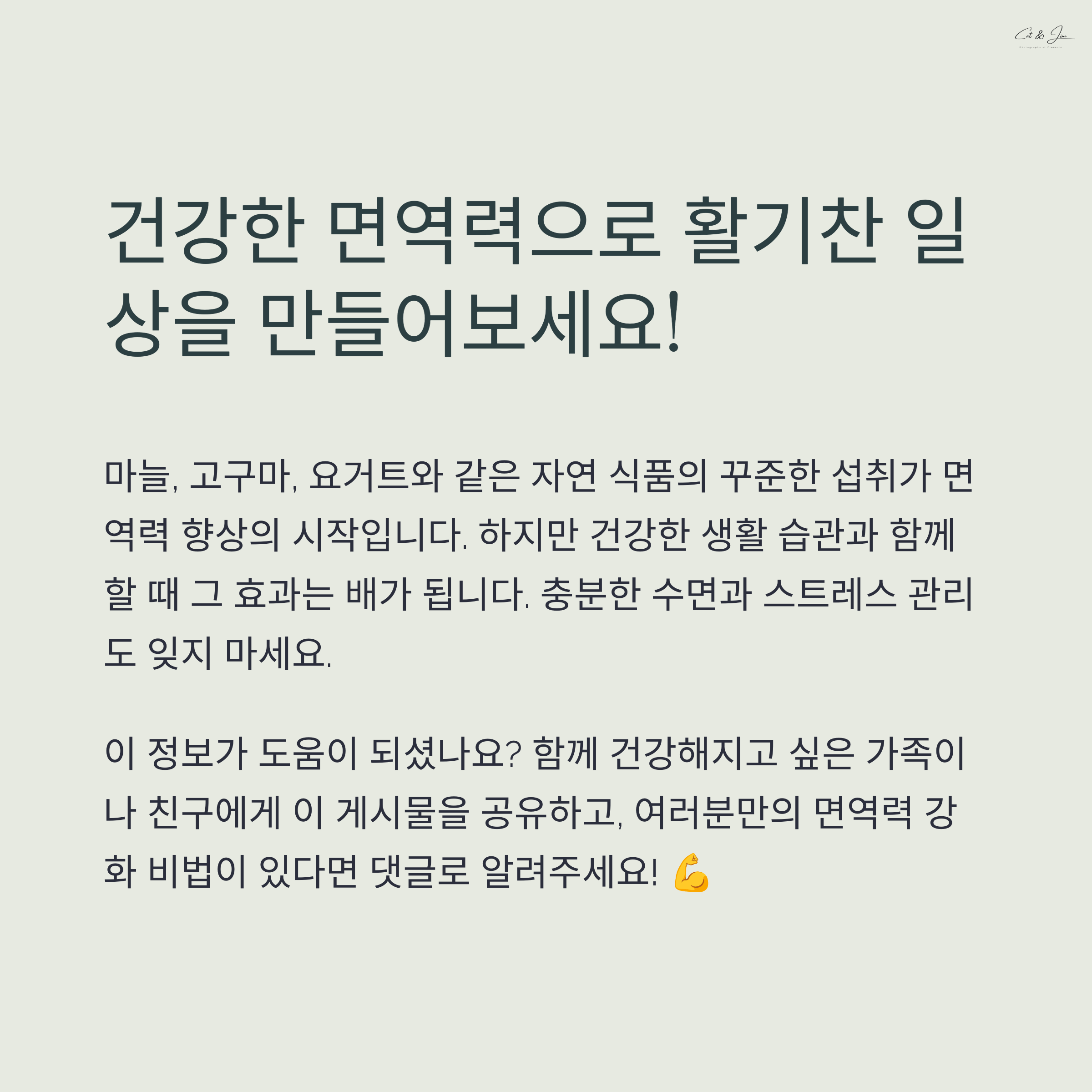 여러분은 어떤 자연 음식을 면역력 향상에 활용하고 계신가요? 혹시 효과를 경험한 음식이나 팁이 있다면 댓글로 공유해주세요. 다른 분들에게도 큰 도움이 될 수 있습니다!