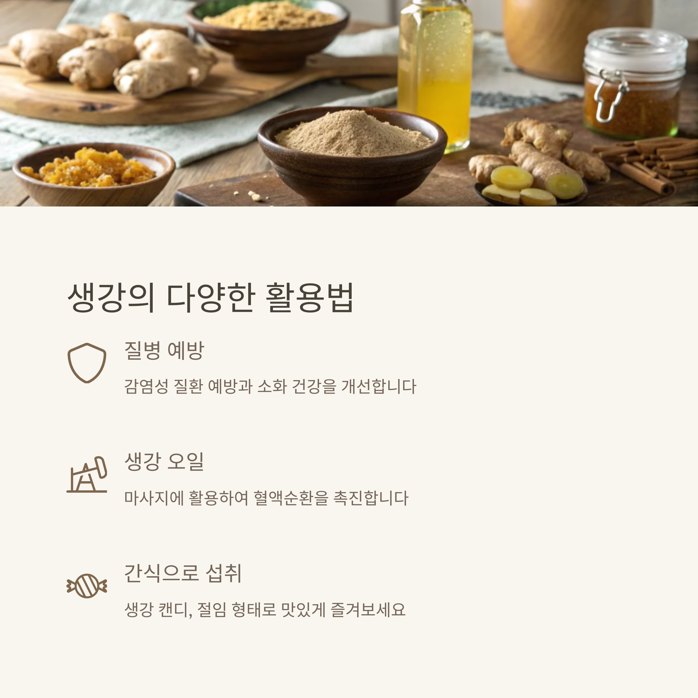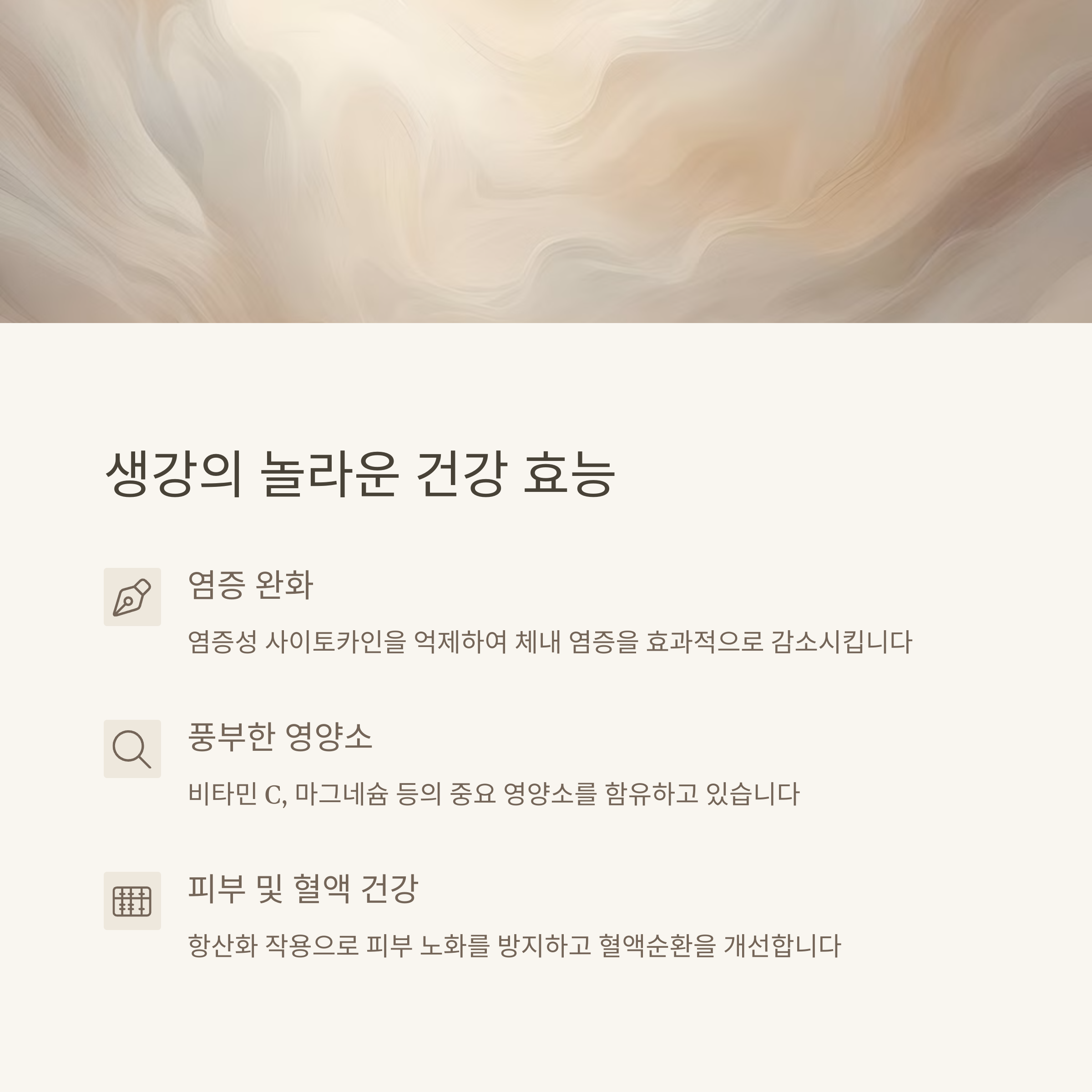 | 면역력 강화, 감기 예방, 항염증 작용 | 생강차, 요리, 스무디, 고농축 제품 | 고용량 섭취 시 속쓰림, 특정 약물과 상호작용 |