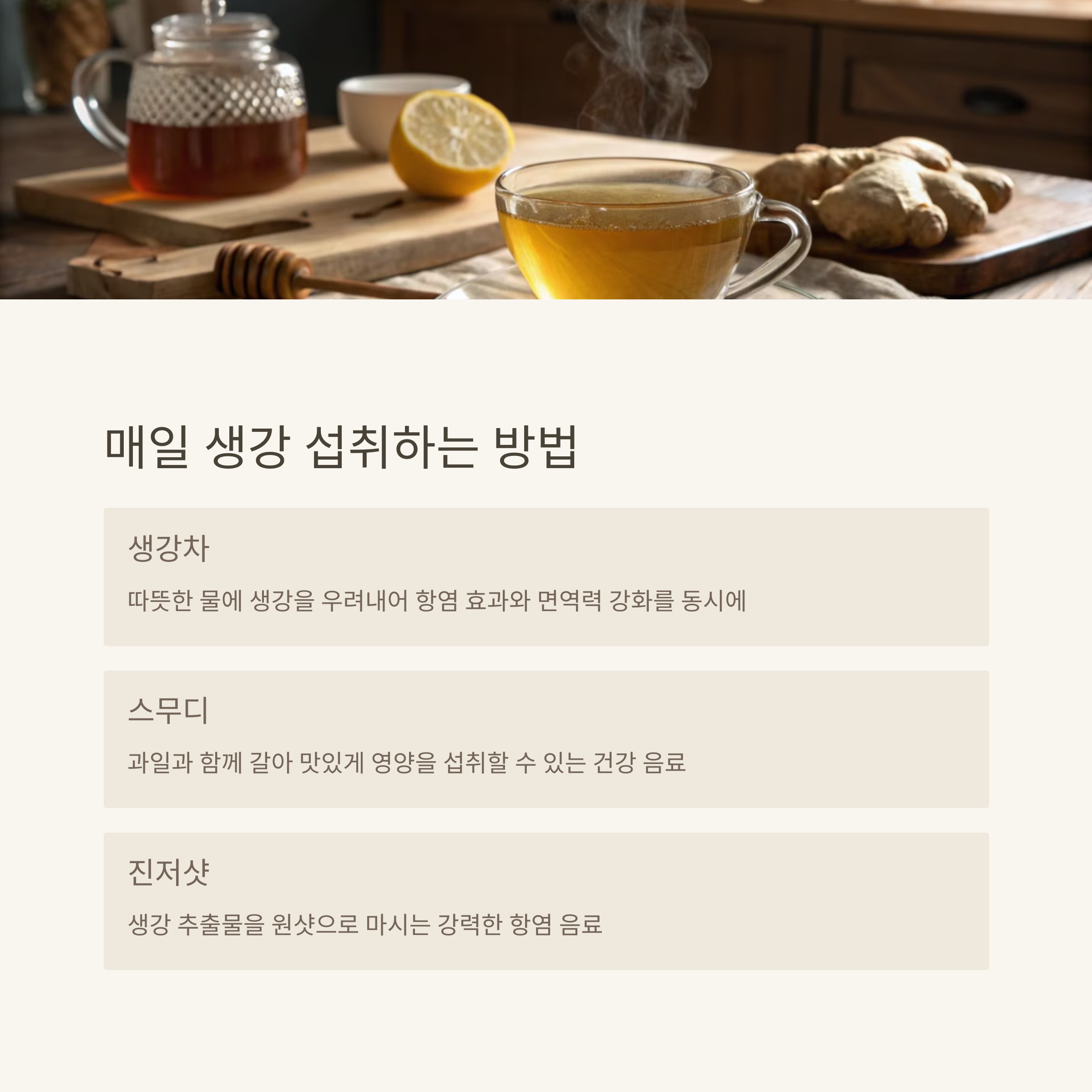 | 면역력 강화, 감기 예방, 항염증 작용 | 생강차, 요리, 스무디, 고농축 제품 | 고용량 섭취 시 속쓰림, 특정 약물과 상호작용 |