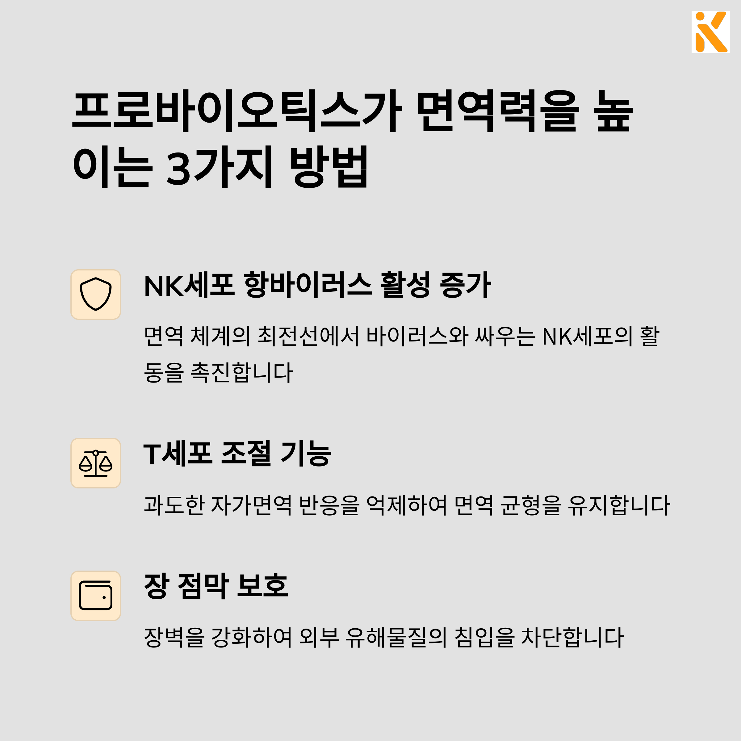 유산균으로 면역 자극 및 균형 유지 NK세포, T세포, 수지상세포 활성화 장점막 보호, 점액층 강화, pH 조절