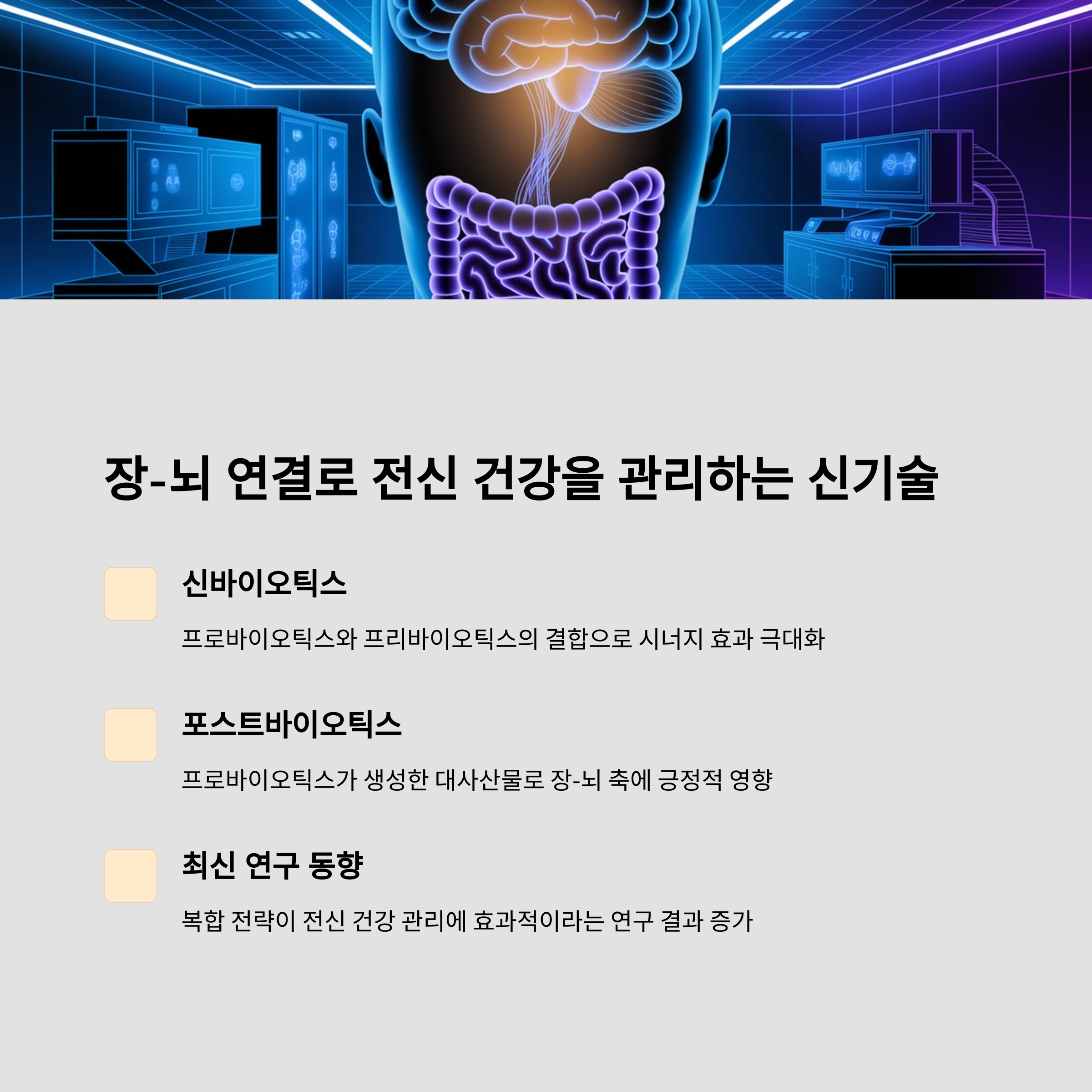 프리바이오틱스는 프로바이오틱스의 성장을 돕는 섬유질로, SCFA(단쇄지방산)를 생산하여 면역세포 활성화에 기여합니다. 특히 프락토올리고당과 이눌린은 대식세포의 식균능력을 높이고 Th1/Th2 면역 균형을 조절합니다. 최근에는 신바이오틱스와 포스트바이오틱스가 주목받으며, 이들을 복합적으로 활용하면 장내 유익균 증식은 물론 면역력 개선에 있어 시너지 효과를 기대할 수 있습니다. 장-뇌 축을 통해 뇌 기능에도 영향을 주는 장 건강은 전신 건강을 위해 지속적으로 관리되어야 합니다.