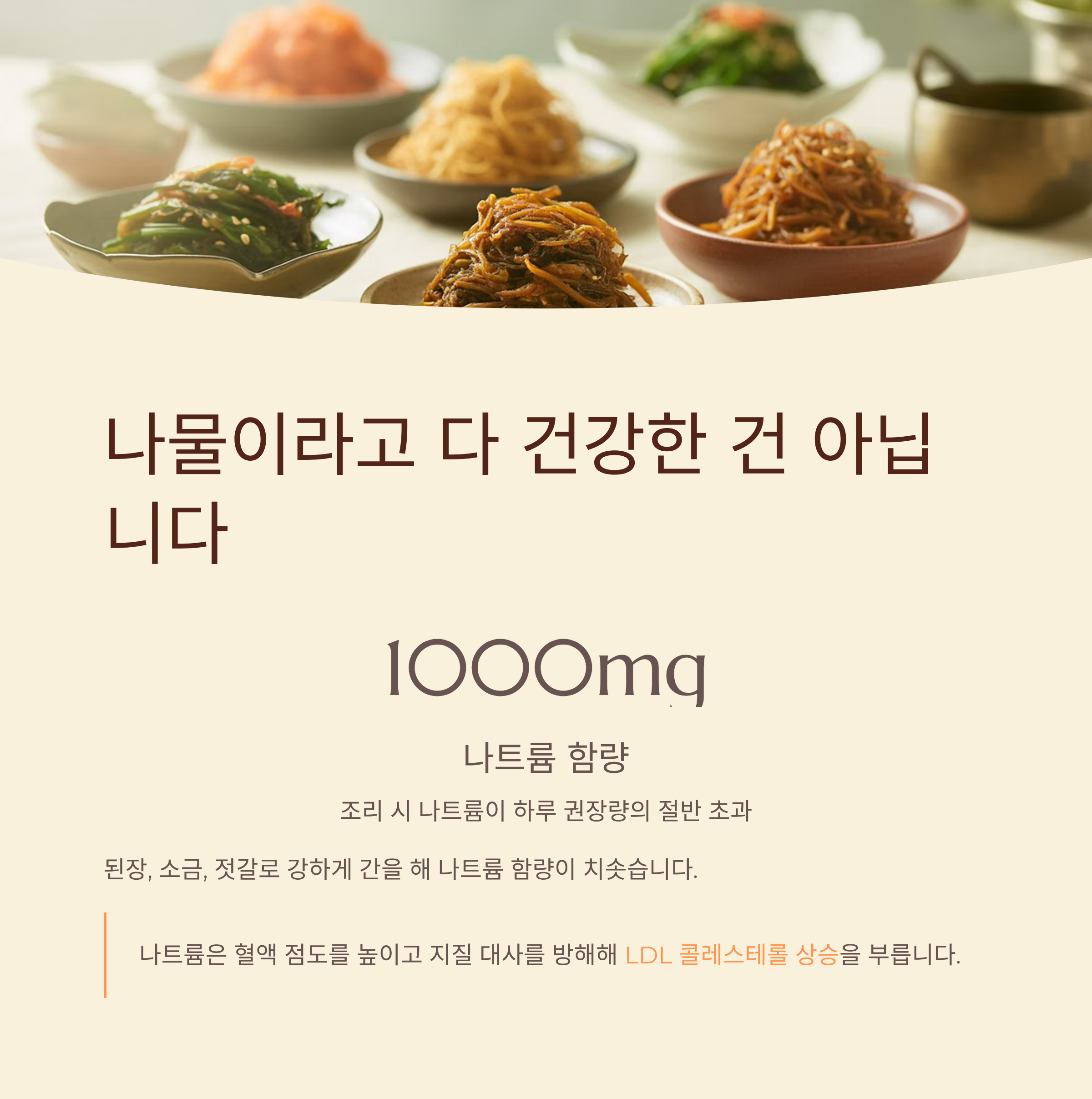 많은 분들이 나물은 건강한 음식이라고 생각하지만, 명절에는 된장, 소금, 젓갈 등으로 강하게 간을 해 나트륨 함량이 치솟습니다.