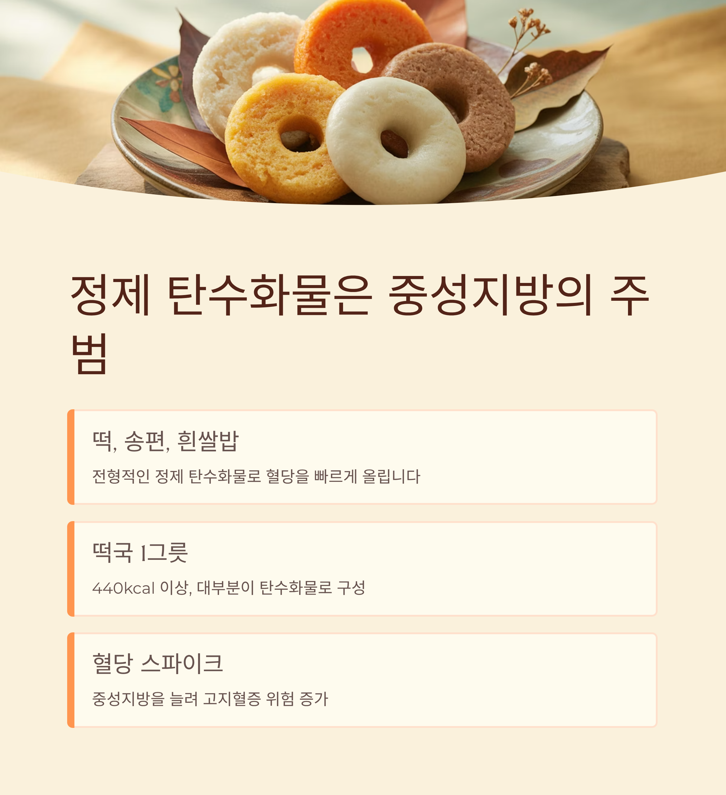 특히 떡국은 1그릇에 440kcal 이상, 대부분이 탄수화물로 구성되어 있어 혈당 스파이크를 유도합니다.