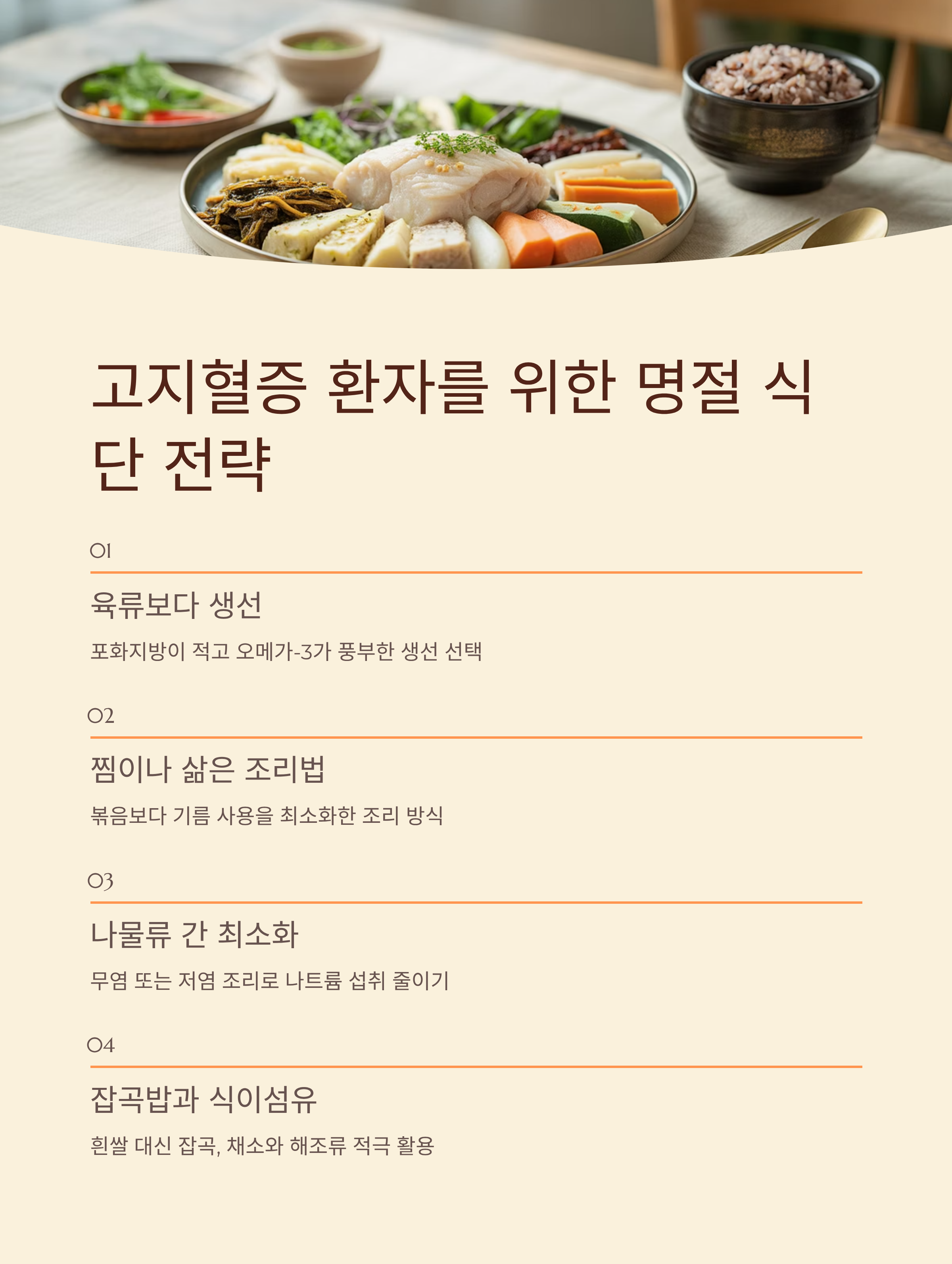 육류보다 생선, 볶음보다 찜이나 삶은 음식, 나물류는 무염 또는 간을 최소화한 조리 방식이 중요합니다.
