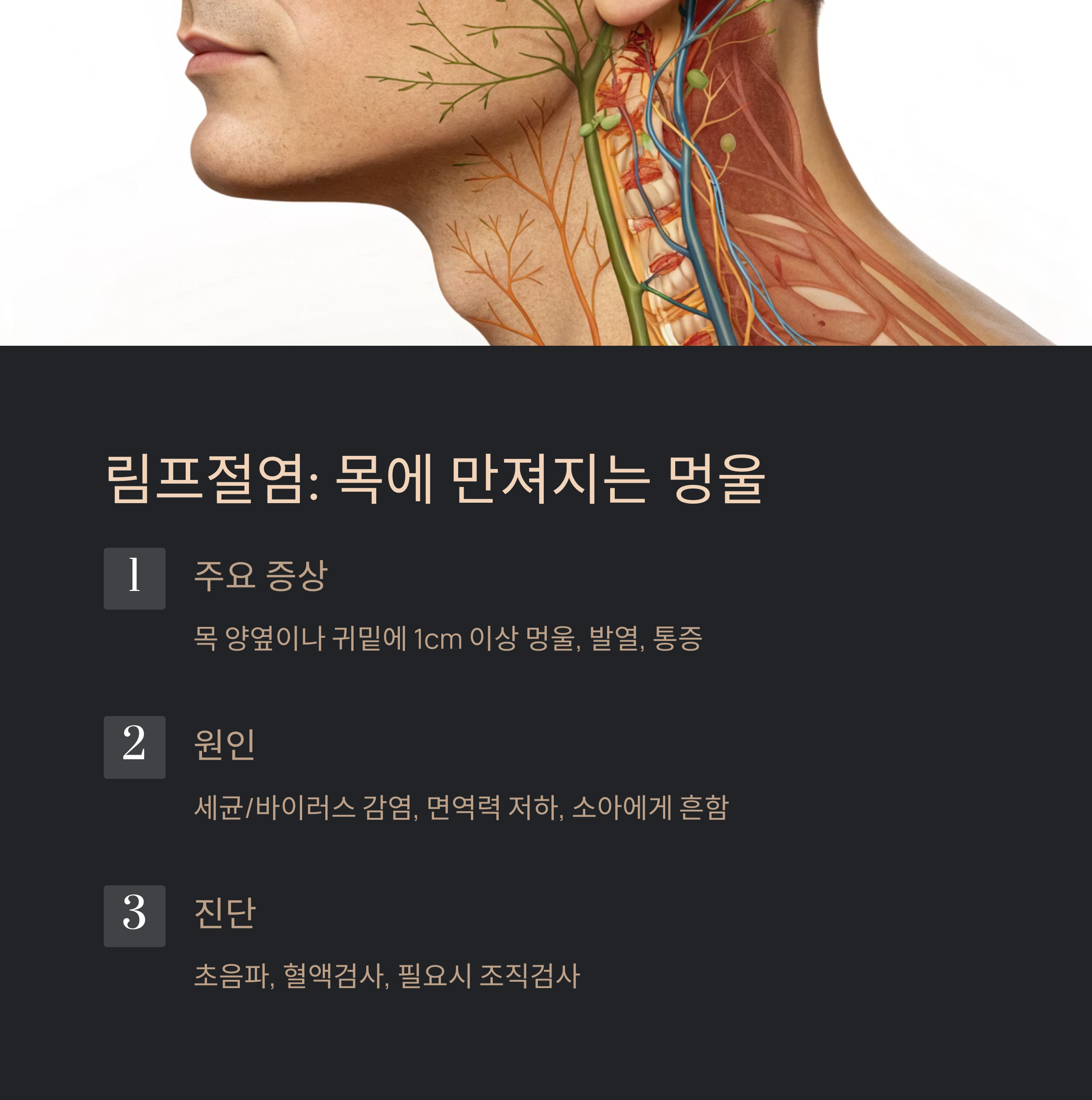| 림프절염 | 목 양옆 등 | 멍울, 발열, 통증 | 초음파, 혈액검사 | 자연호전, 항생제 | 인구 10%가 일생 중 1회 이상 경험 |