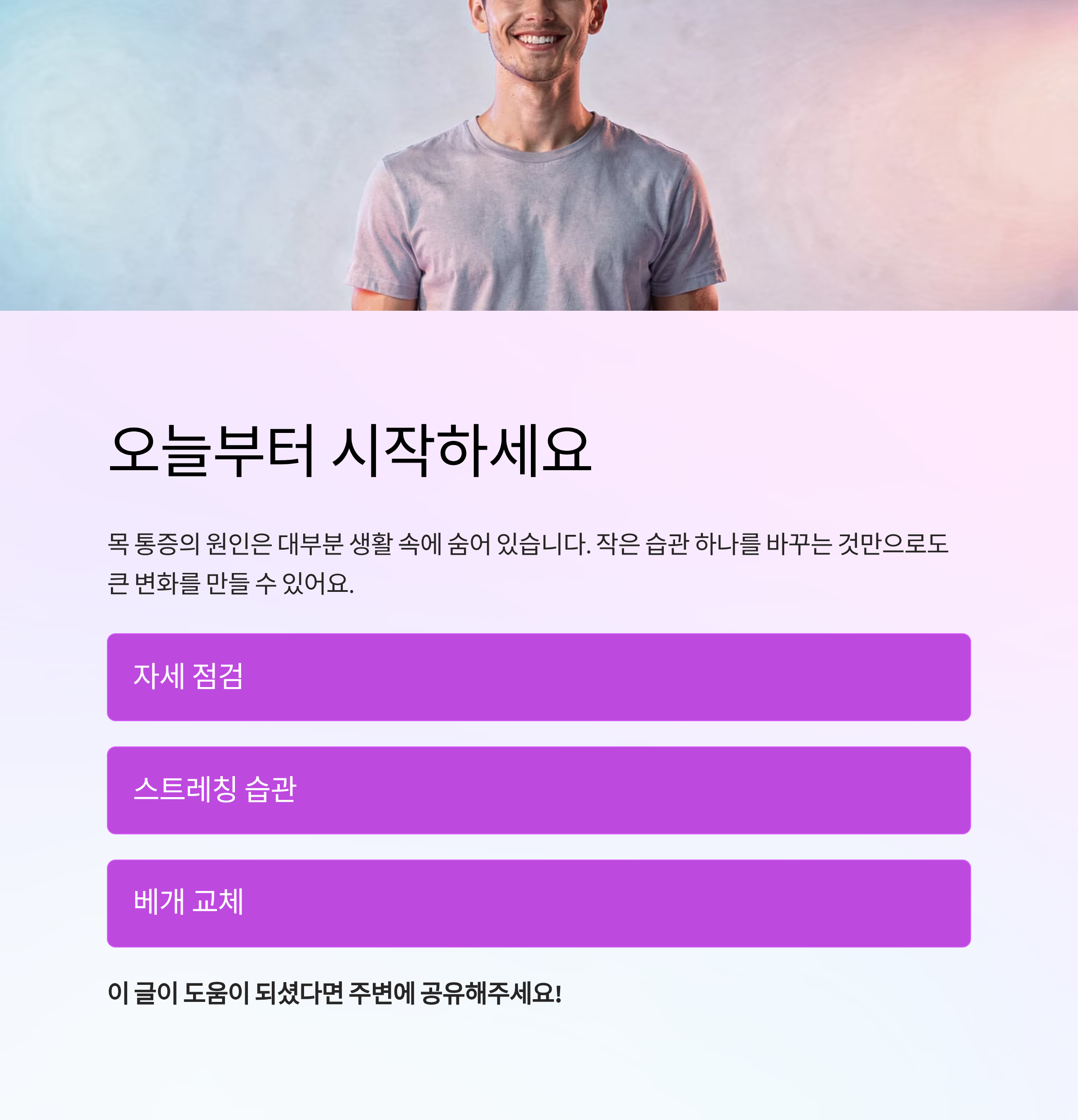 이런 사소한 생활 습관 하나하나가 모여 목 통증을 만들어냅니다.