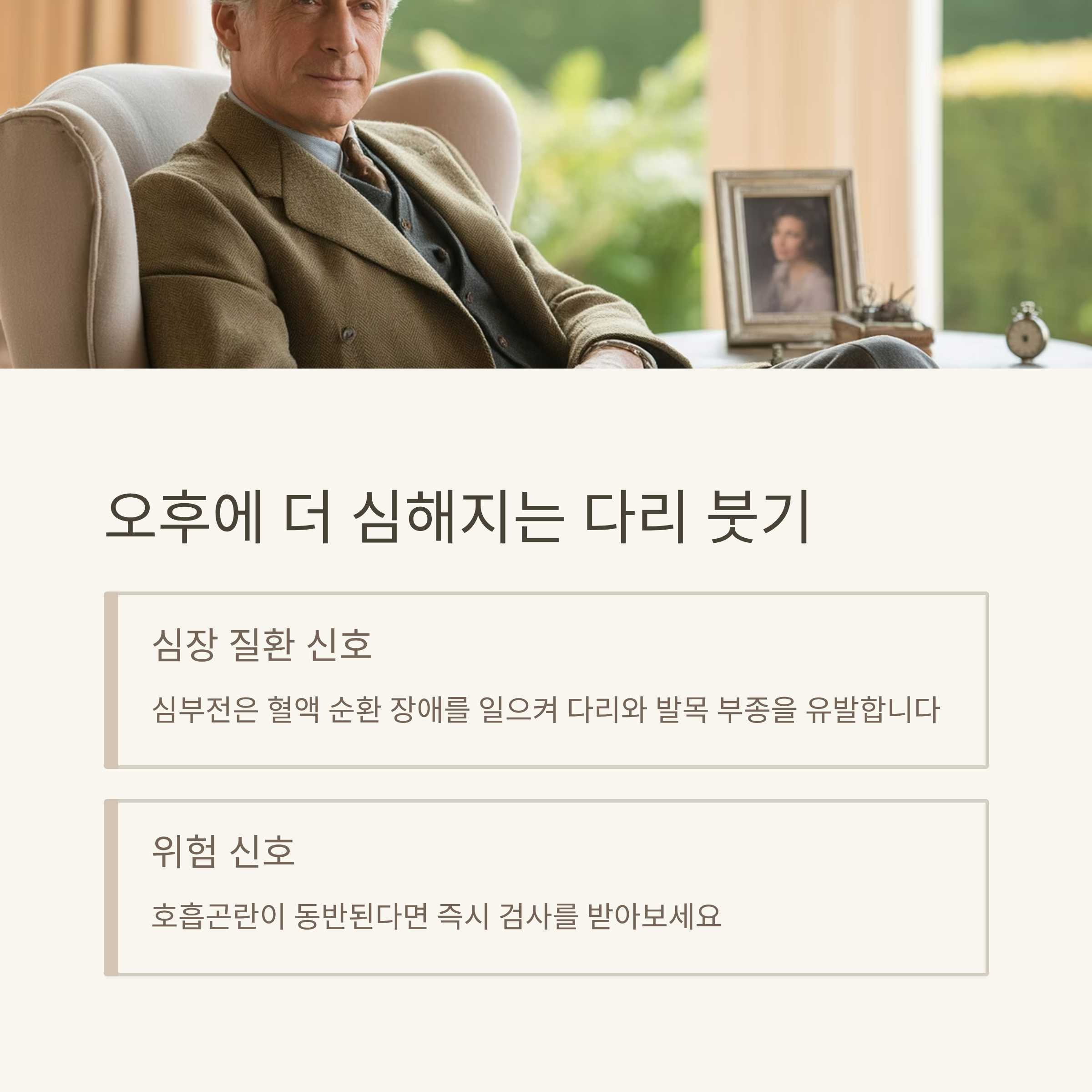 심부전과 같은 심장 질환은 혈액이 원활하게 순환되지 않아 혈액이 정체되고, 이로 인해 다리와 발목 쪽 부종이 생깁니다. 특히 오후에 다리가 무거워지거나 붓는 증상이 심해질 경우에는 심장 검사를 고려해보는 게 좋습니다.