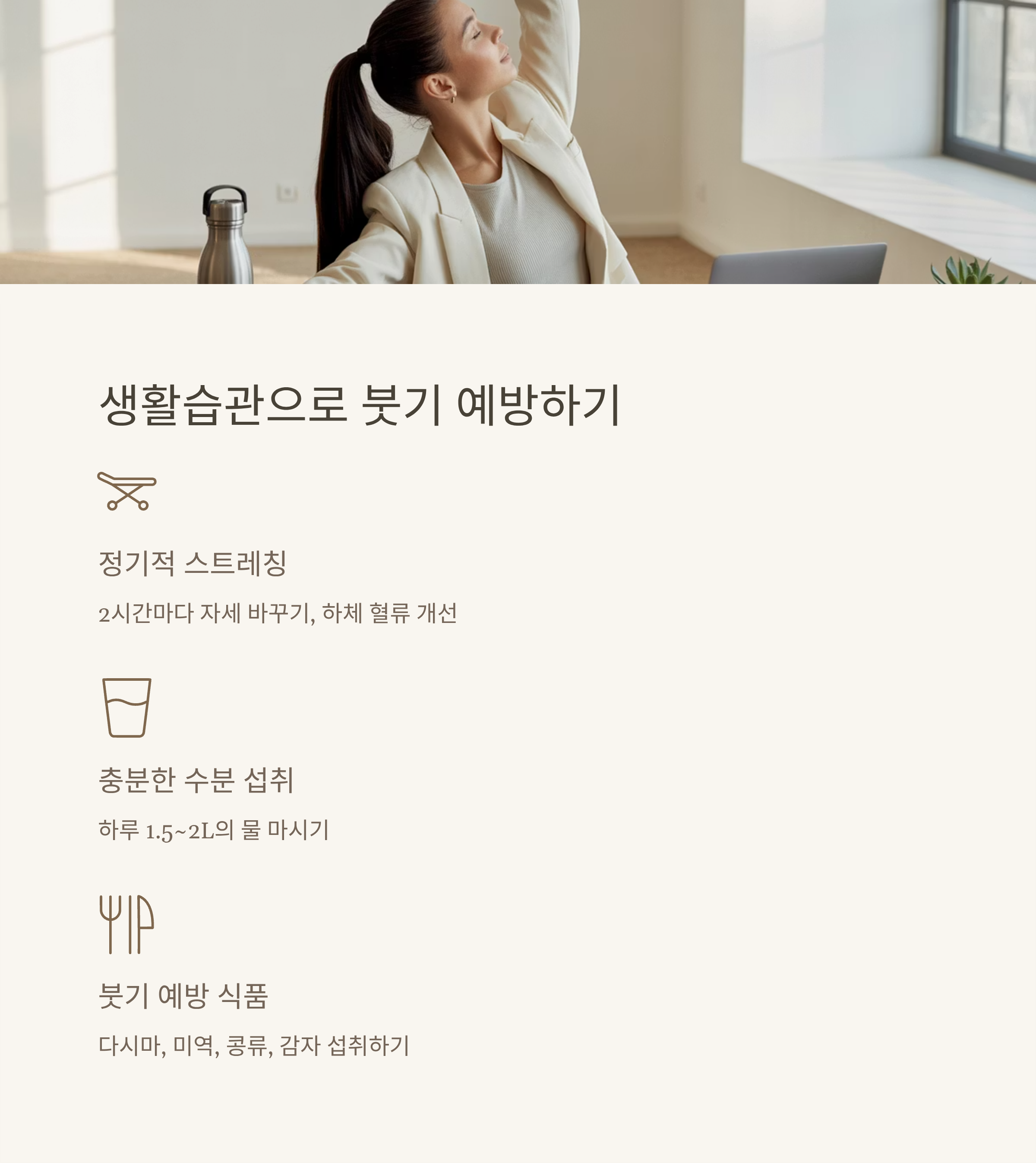 하루 종일 같은 자세로 앉아 있거나 오래 서 있으면 하체 혈류가 정체돼 부종이 심해집니다. 정기적으로 스트레칭을 하거나 2시간마다 자세를 바꾸는 것만으로도 큰 효과를 볼 수 있어요.