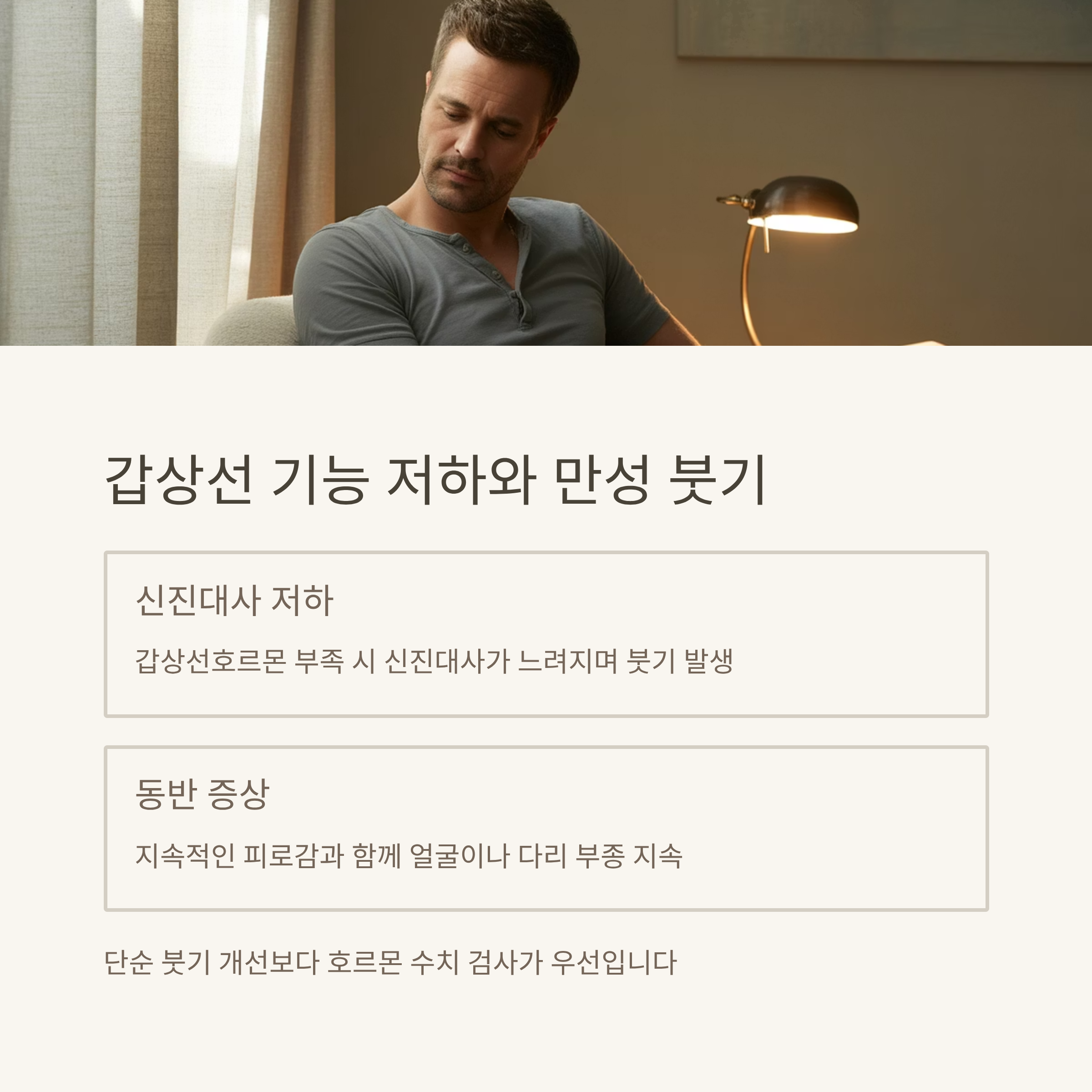 갑상선호르몬이 부족해지면 신진대사가 느려지면서 붓기와 피로가 동시에 찾아옵니다. 아침에 일어나도 피로감이 가시지 않고, 얼굴이나 다리가 붓는 느낌이 지속된다면 갑상선 기능 저하를 의심해볼 필요가 있어요.