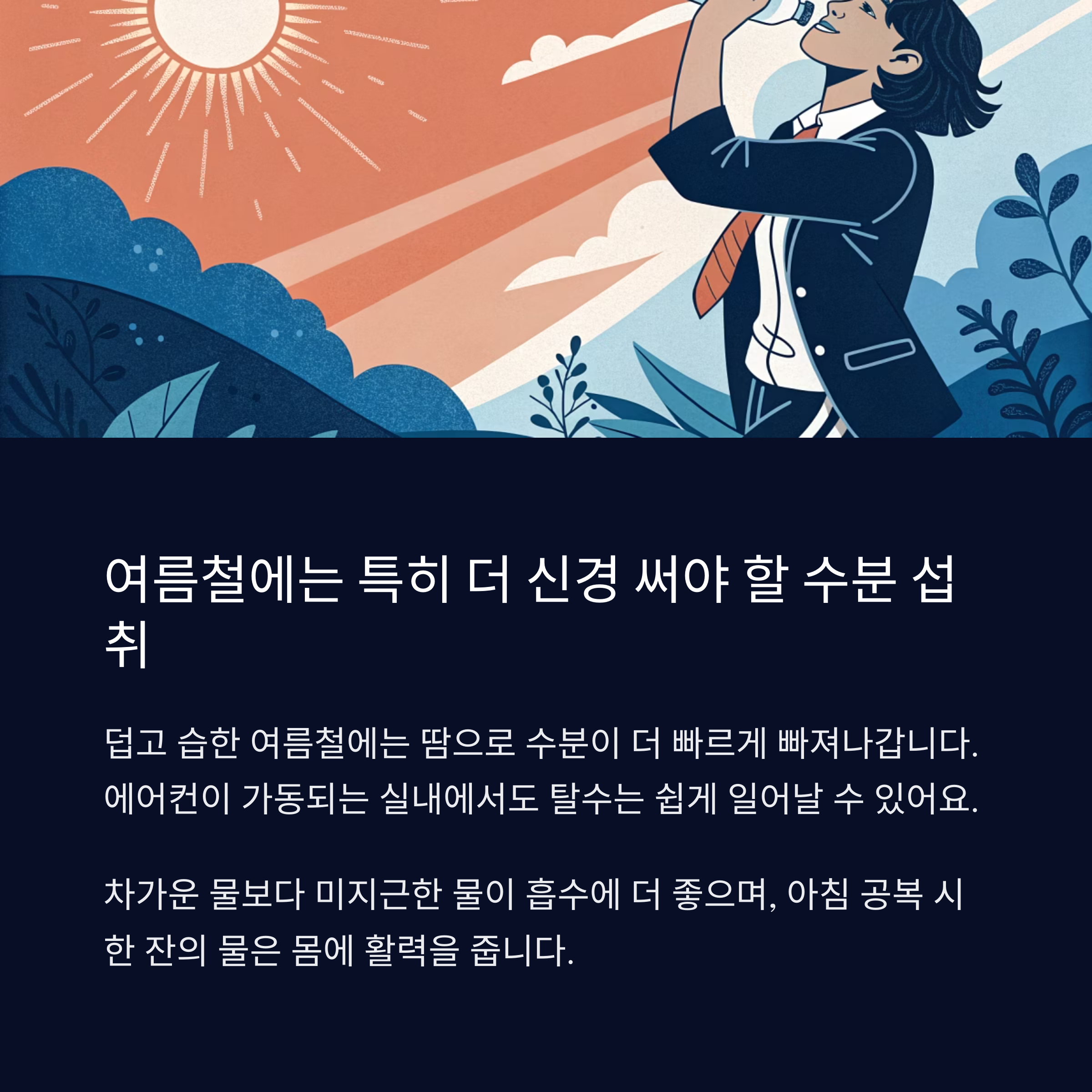 덥고 습한 여름철에는 땀을 통해 수분이 더 빠르게 빠져나갑니다.
