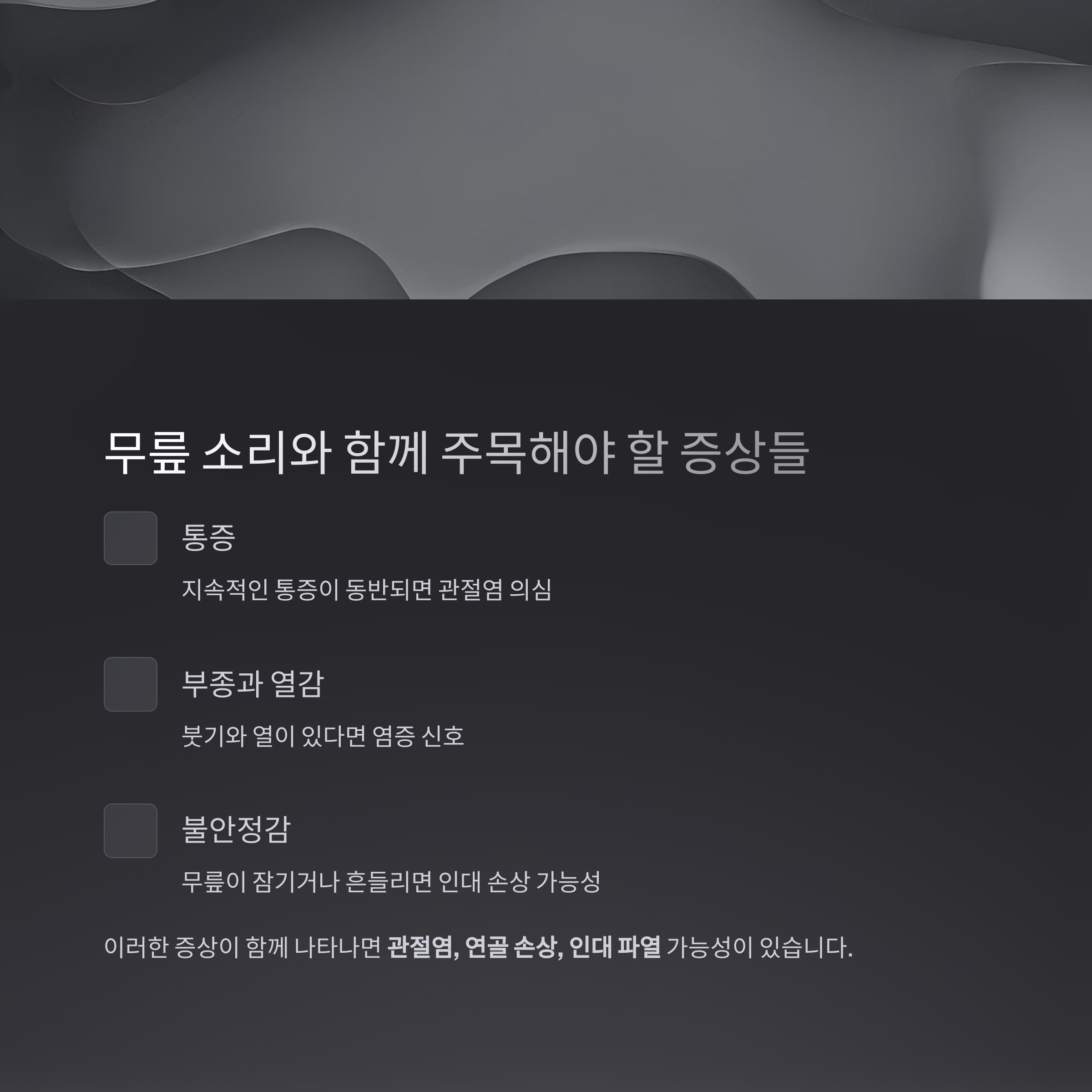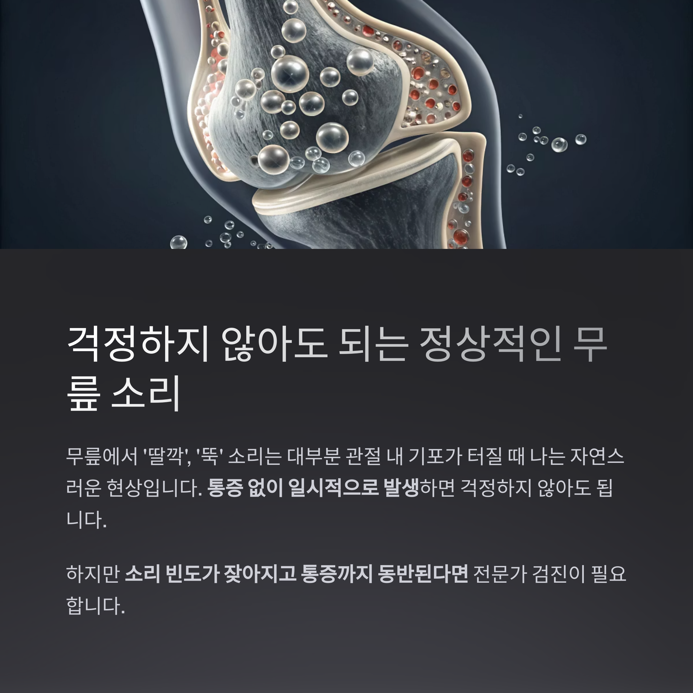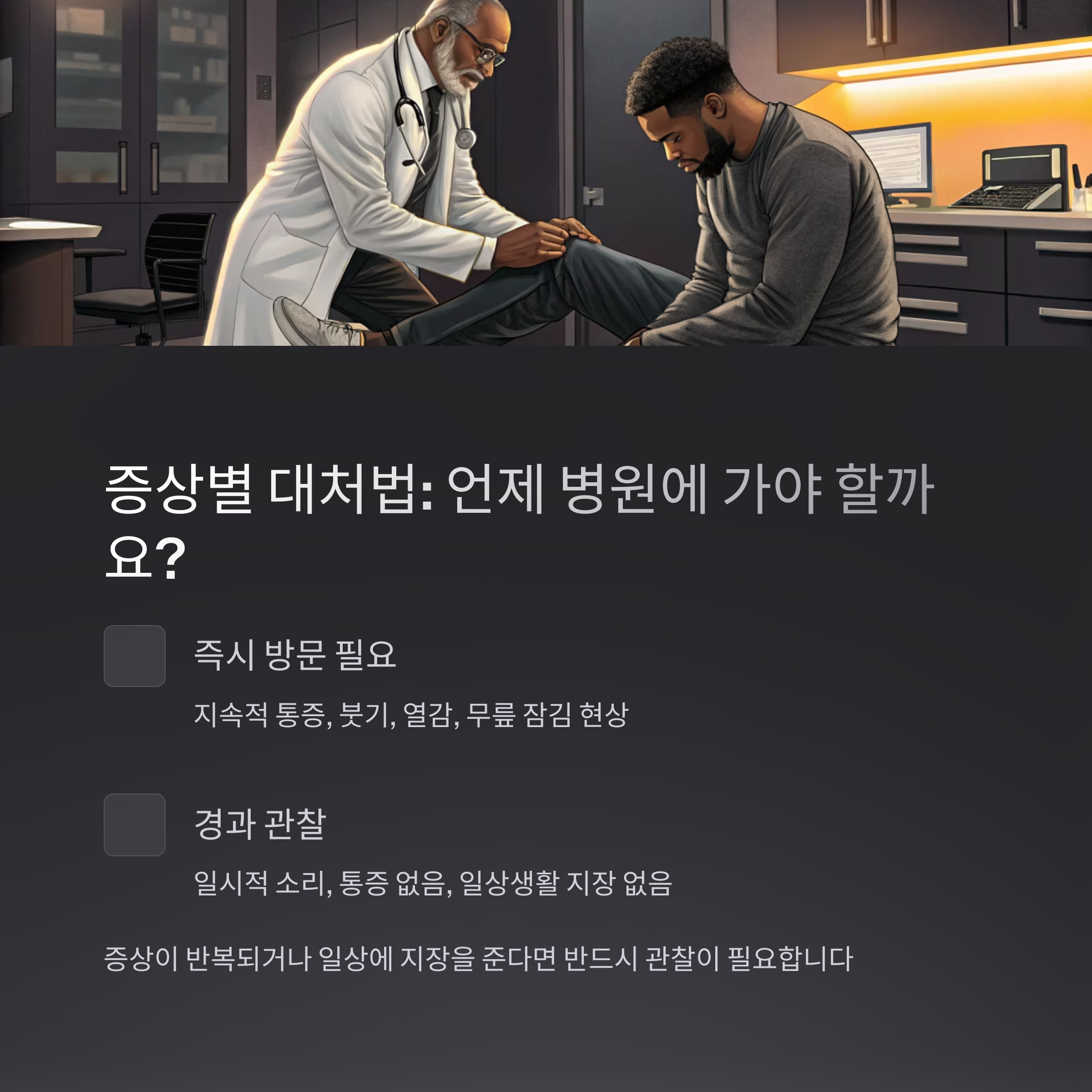 | ‘딱딱’, ‘뚝뚝’ | 관절염, 연골연화증 | 뼈끼리 마찰되며 통증 동반 |