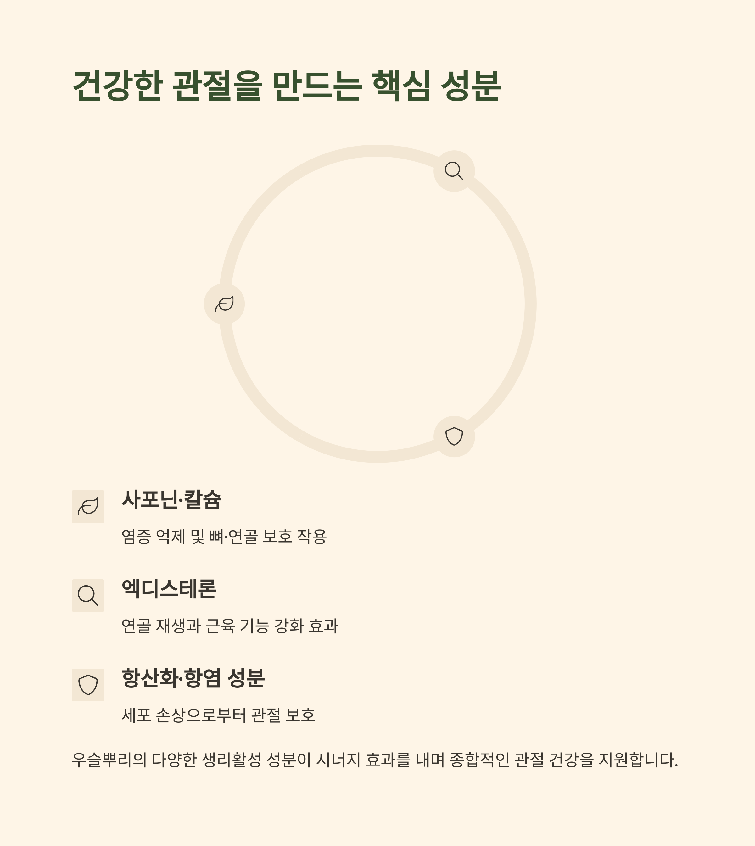 우슬뿌리차는 오랜 시간 동안 관절 건강을 위한 천연 치료제로 사용되어 왔으며, 그 핵심은 바로 풍부한 유효 성분에 있습니다. 사포닌은 강력한 항염 작용으로 관절 내 염증을 억제하고, 엑디스테론은 연골 세포 증식을 도와 손상된 관절 회복에 도움을 줍니다. 칼슘은 뼈 건강을 유지하며, 트리테르펜은 진통 효과를 발휘해 무릎 통증을 효과적으로 완화시킵니다. 특히 우슬뿌리차는 다른 건강 차들과 달리 임상 연구를 통해 효과가 수치로 검증된 사례가 많아 더욱 신뢰를 얻고 있습니다.