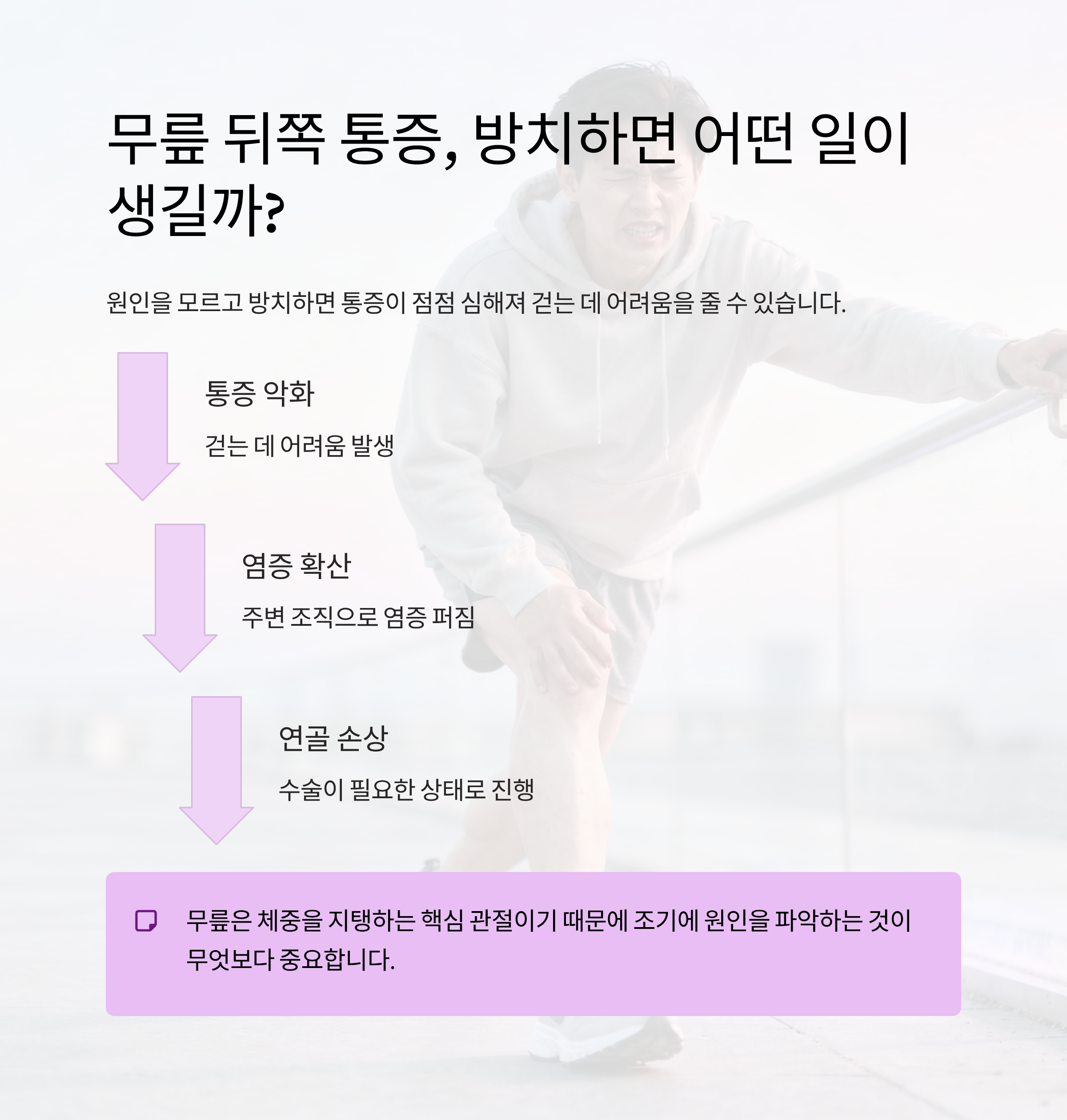 무릎은 체중을 지탱하는 핵심 관절이기 때문에 조기에 원인을 파악하는 것이 무엇보다 중요합니다.