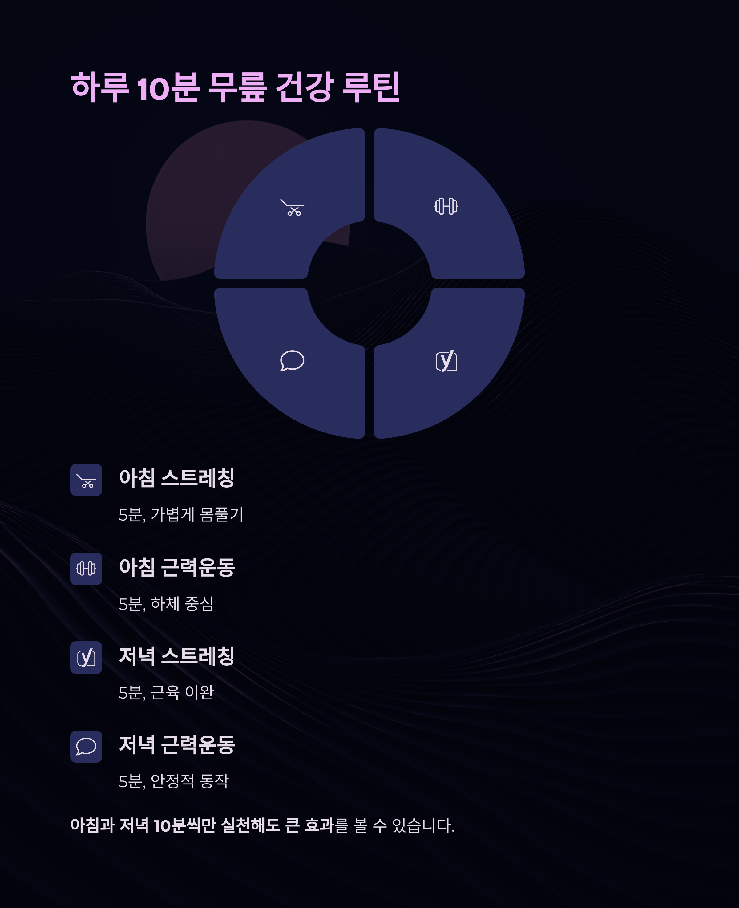 스트레칭과 근력운동을 아침과 저녁 10분씩만 실천해도 큰 효과를 볼 수 있습니다.