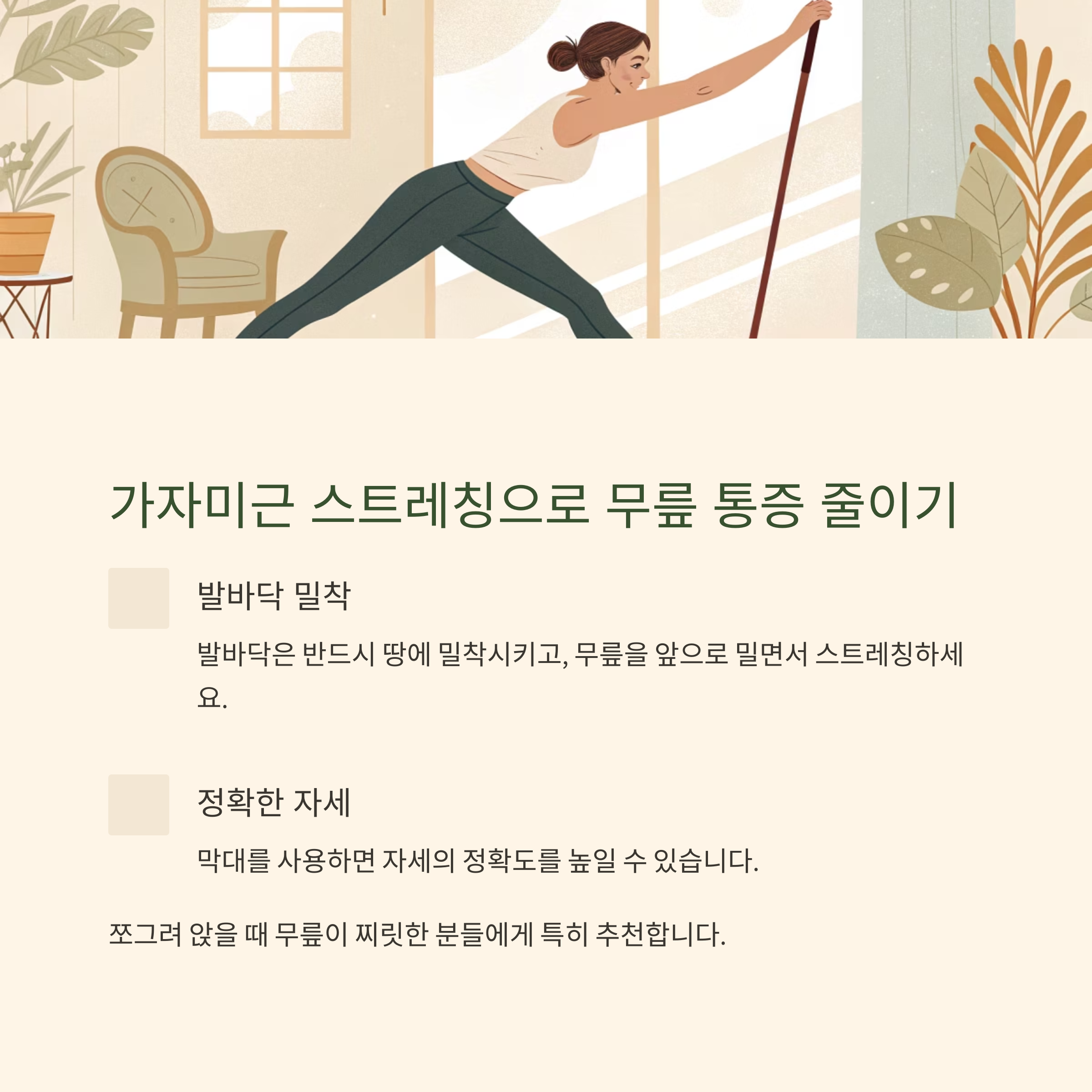 무릎 스트레칭도 과하지 않고 지속 가능한 루틴이 필요합니다.