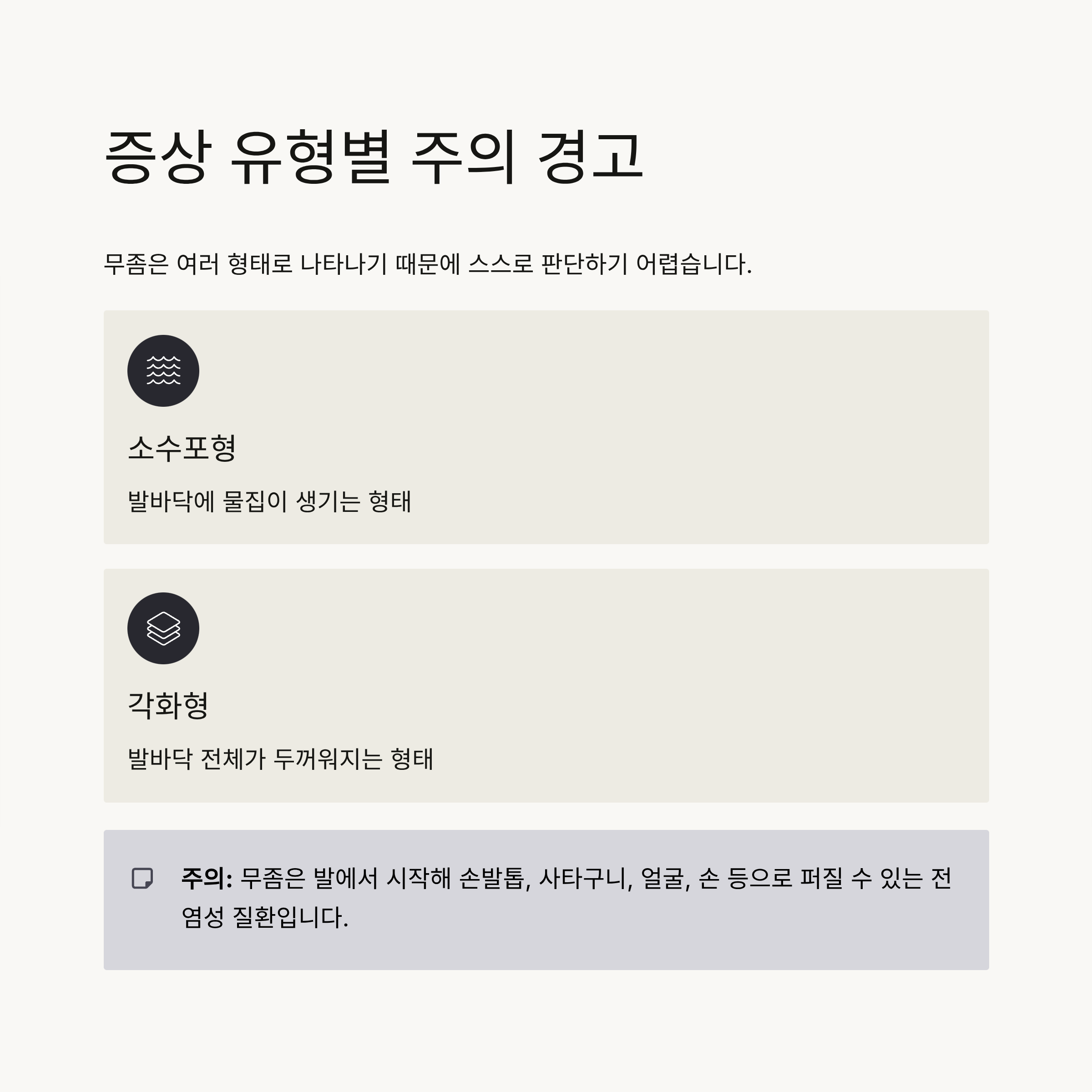 이런 증상은 단순 무좀을 넘어 이차 감염(봉와직염 등)의 위험으로 이어질 수 있습니다.