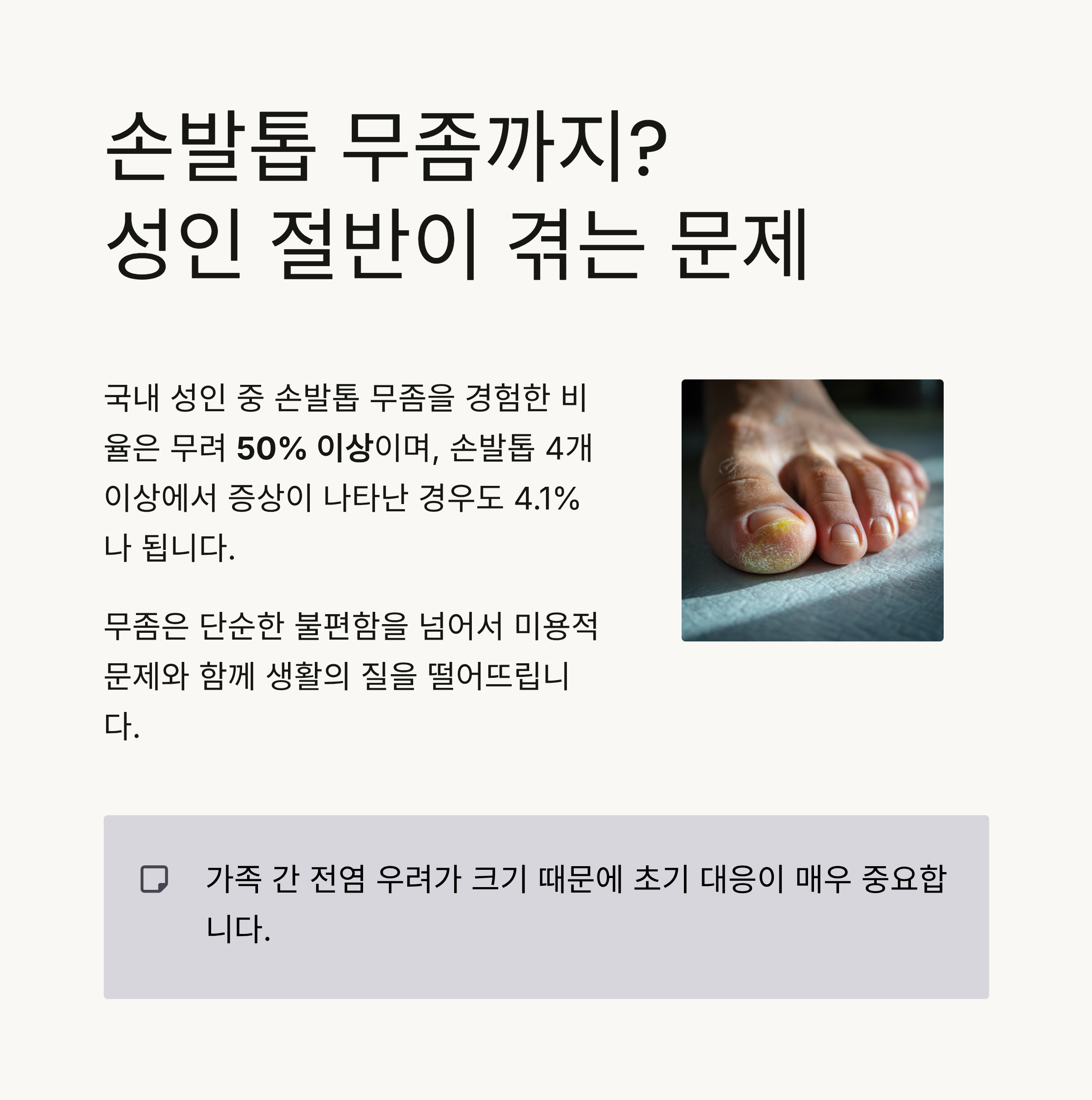 국내 성인 중 손발톱 무좀을 경험한 비율은 무려 50% 이상이며,