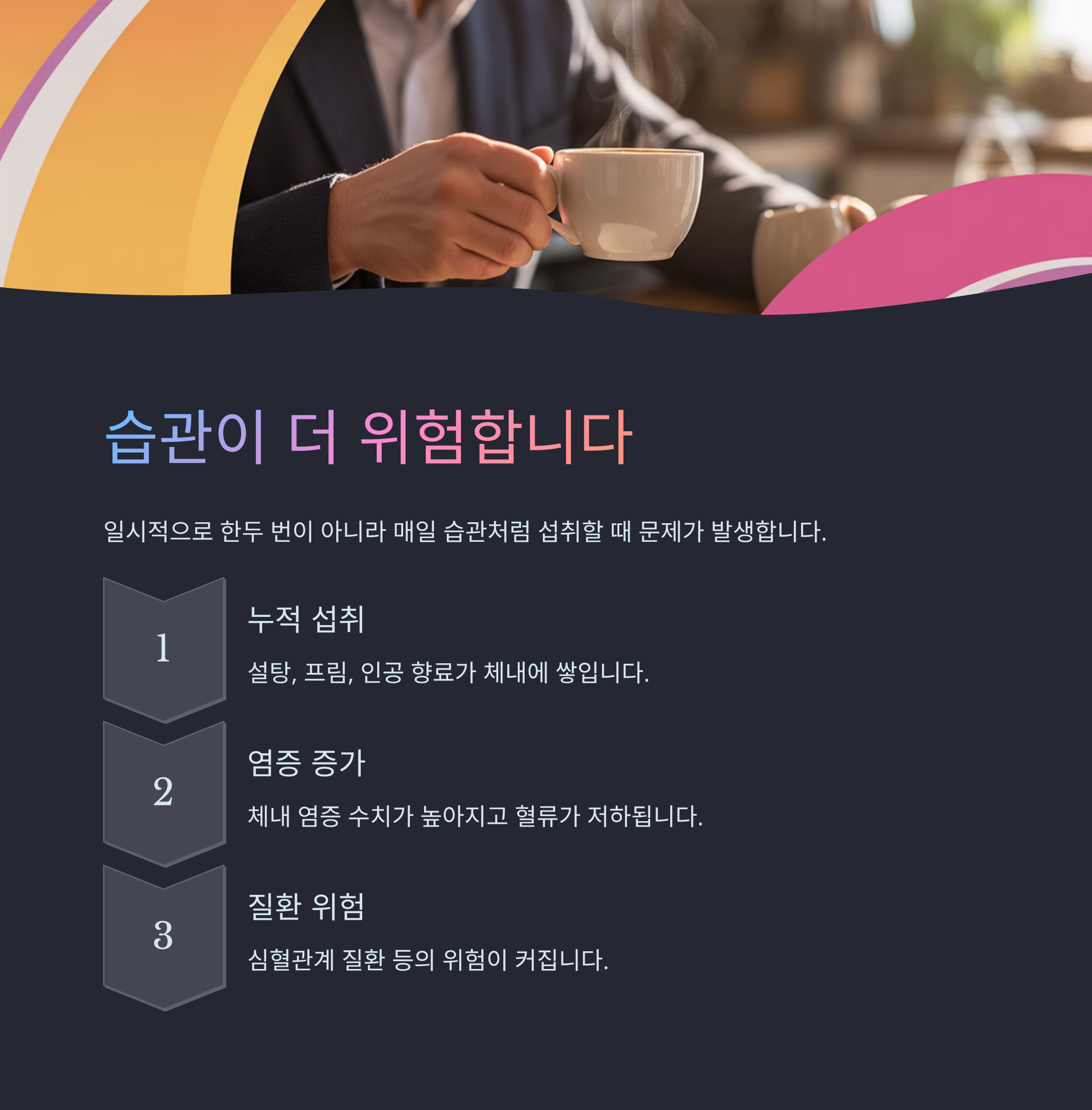 문제는 이러한 음료들을 일시적으로 한두 번 마시는 것이 아니라, 매일 습관처럼 섭취하게 될 때 발생합니다. 설탕, 프림, 인공 향료가 누적되면서 체내 염증 수치 증가, 혈류 저하, 심혈관계 질환 등의 위험을 키울 수 있습니다.