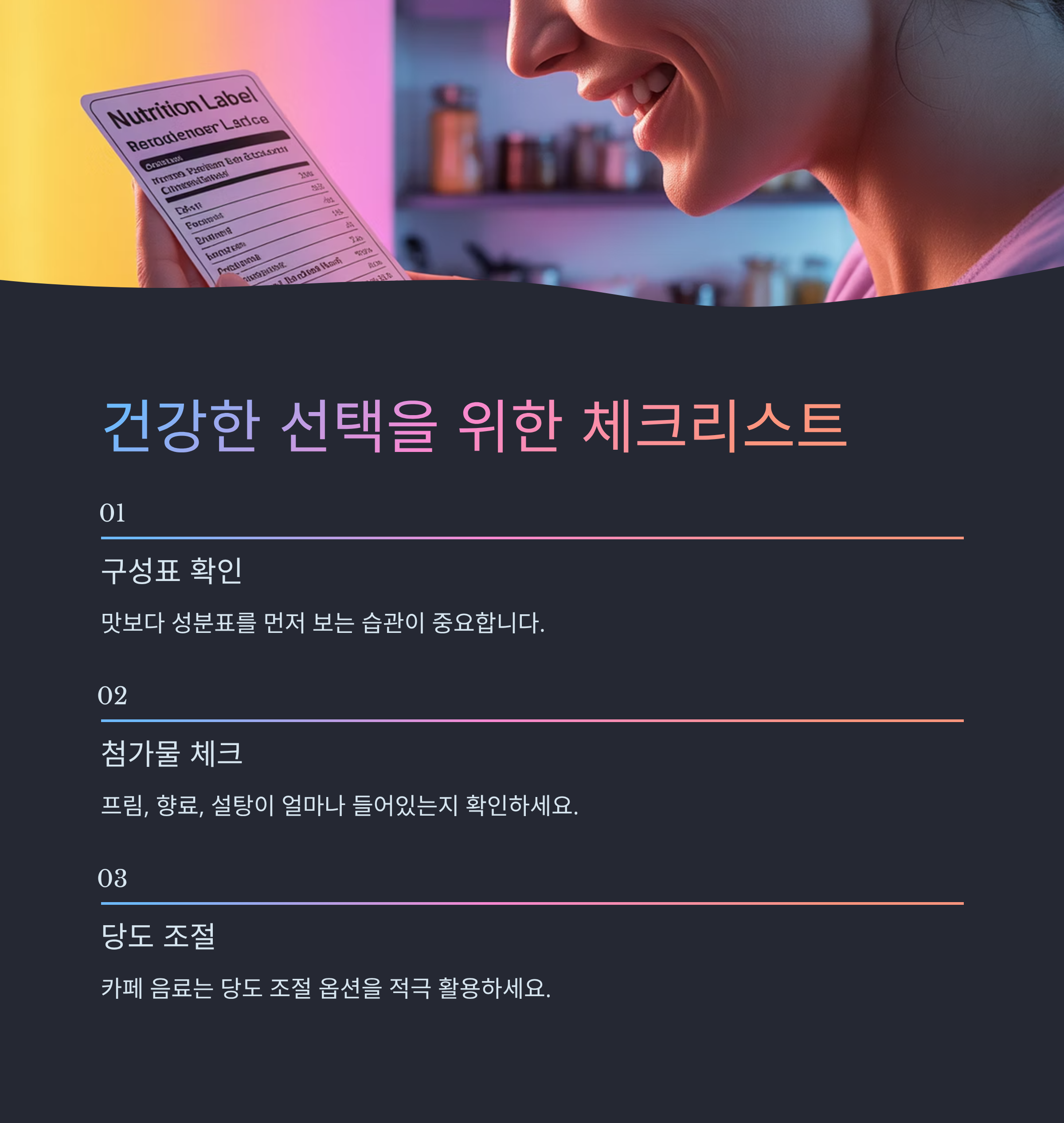 커피를 고를 때는 ‘맛’보다는 ‘구성표’를 먼저 보는 습관이 중요합니다. 어떤 성분이 얼마나 들어 있는지, 특히 프림이나 향료, 설탕이 얼마나 첨가됐는지를 체크해야 합니다. 카페 음료라도 ‘당도 조절 가능’ 옵션이 있다면 적극 활용하는 것이 좋습니다.
