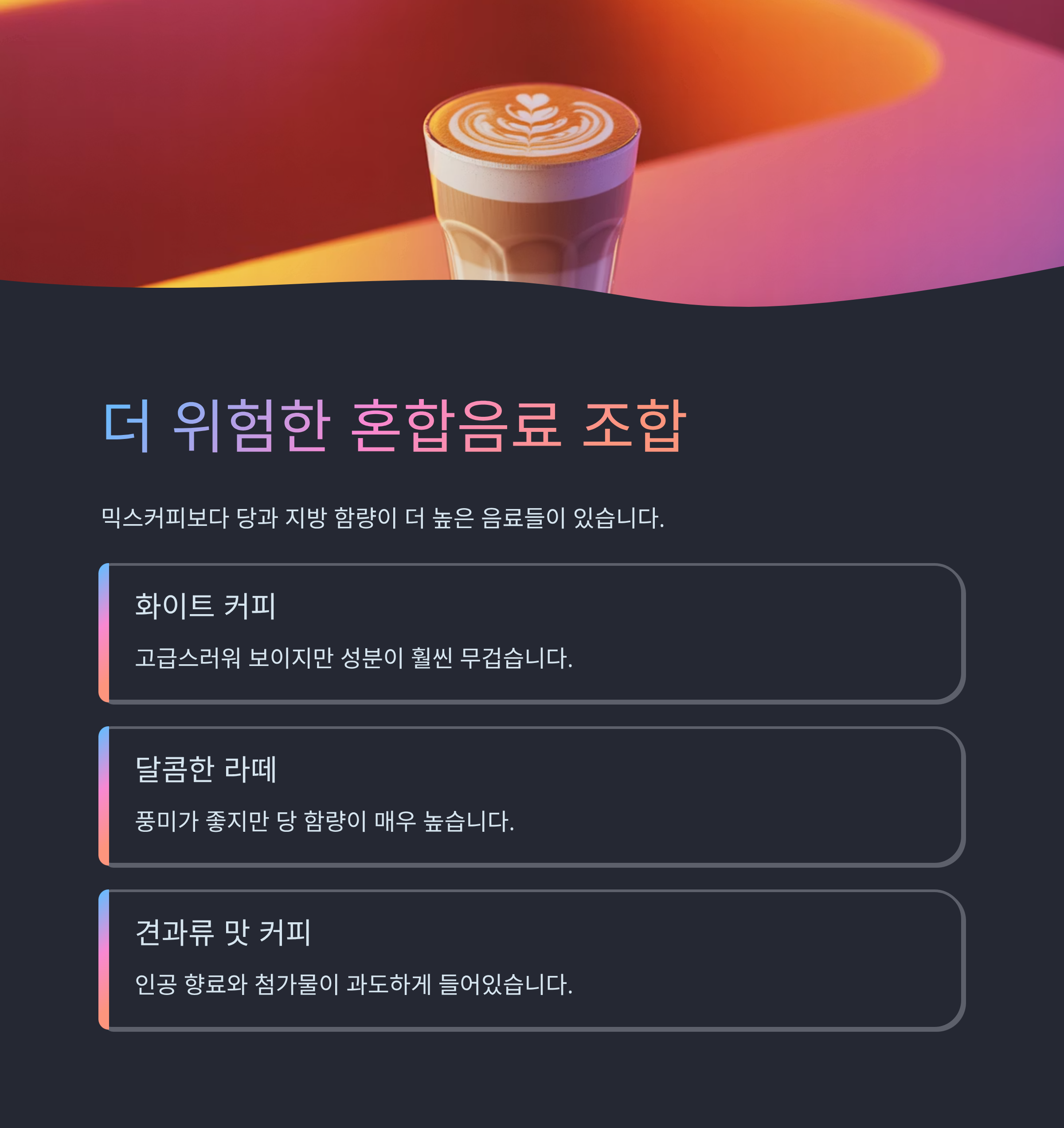 건강을 위해 믹스커피를 줄이려는 분들이 많아졌지만, 생각보다 더 주의해야 할 조합이 있습니다. 바로 설탕, 프림, 인공 향료 등이 과도하게 들어간 음료들이죠. 믹스커피보다 더 달콤하고 고소하게 느껴지지만, 그 안에 숨어 있는 건강 위협은 더 클 수 있습니다. 이 글에서는 믹스커피보다 더 조심해야 할 성분 조합과, 자주 섭취할 경우 우리 몸에 어떤 영향을 줄 수 있는지 짚어보겠습니다.