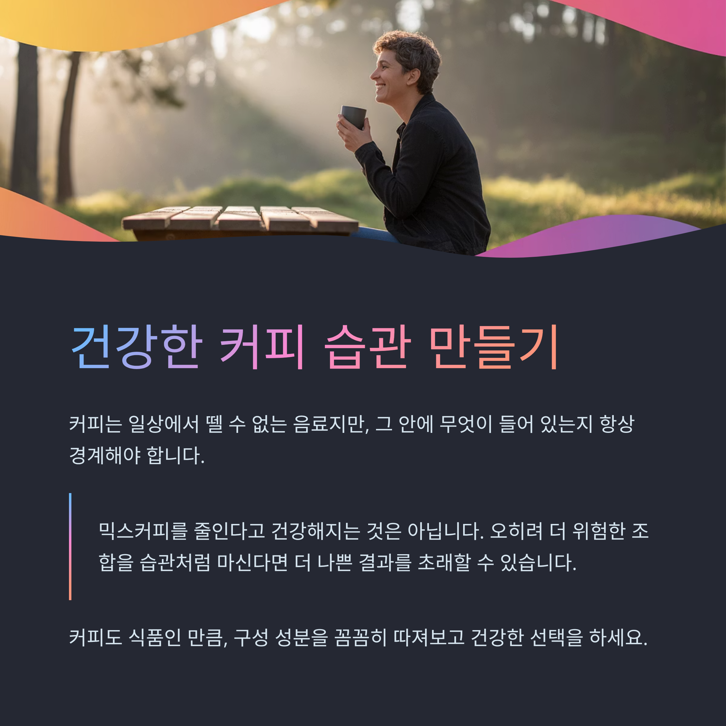 커피는 우리의 일상에서 뗄 수 없는 음료지만, 그 안에 무엇이 들어 있는지는 항상 경계해야 합니다. 믹스커피를 줄인다고 해서 건강해지는 것은 아닙니다. 오히려 ‘믹스커피보다 더 위험한’ 조합을 습관처럼 마신다면 더 나쁜 결과를 초래할 수 있습니다. 커피도 식품인 만큼, 구성 성분을 꼼꼼히 따져보고, 건강한 선택을 하세요.