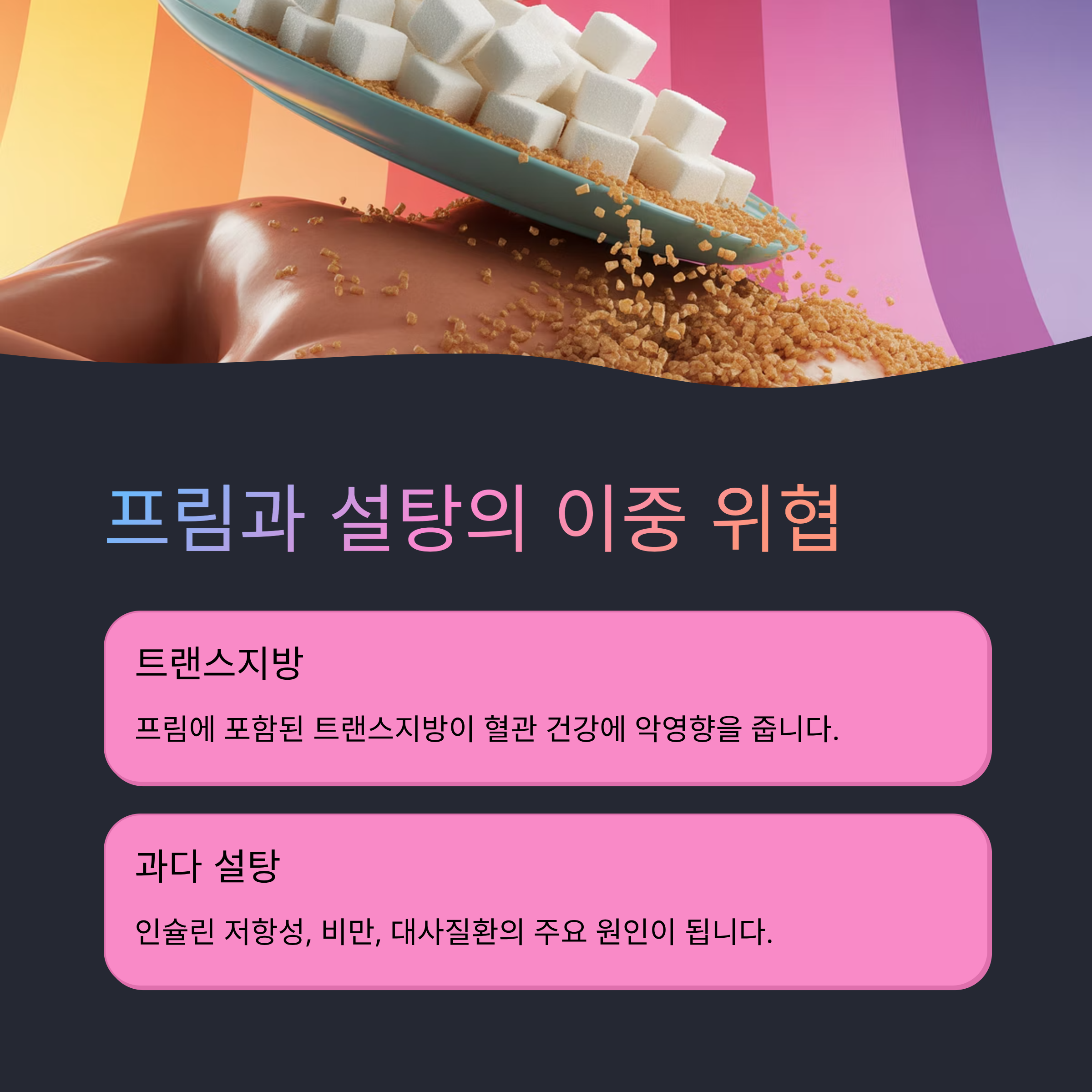 | 트랜스지방 (프림 포함) | LDL 증가, 심혈관 질환 위험 |