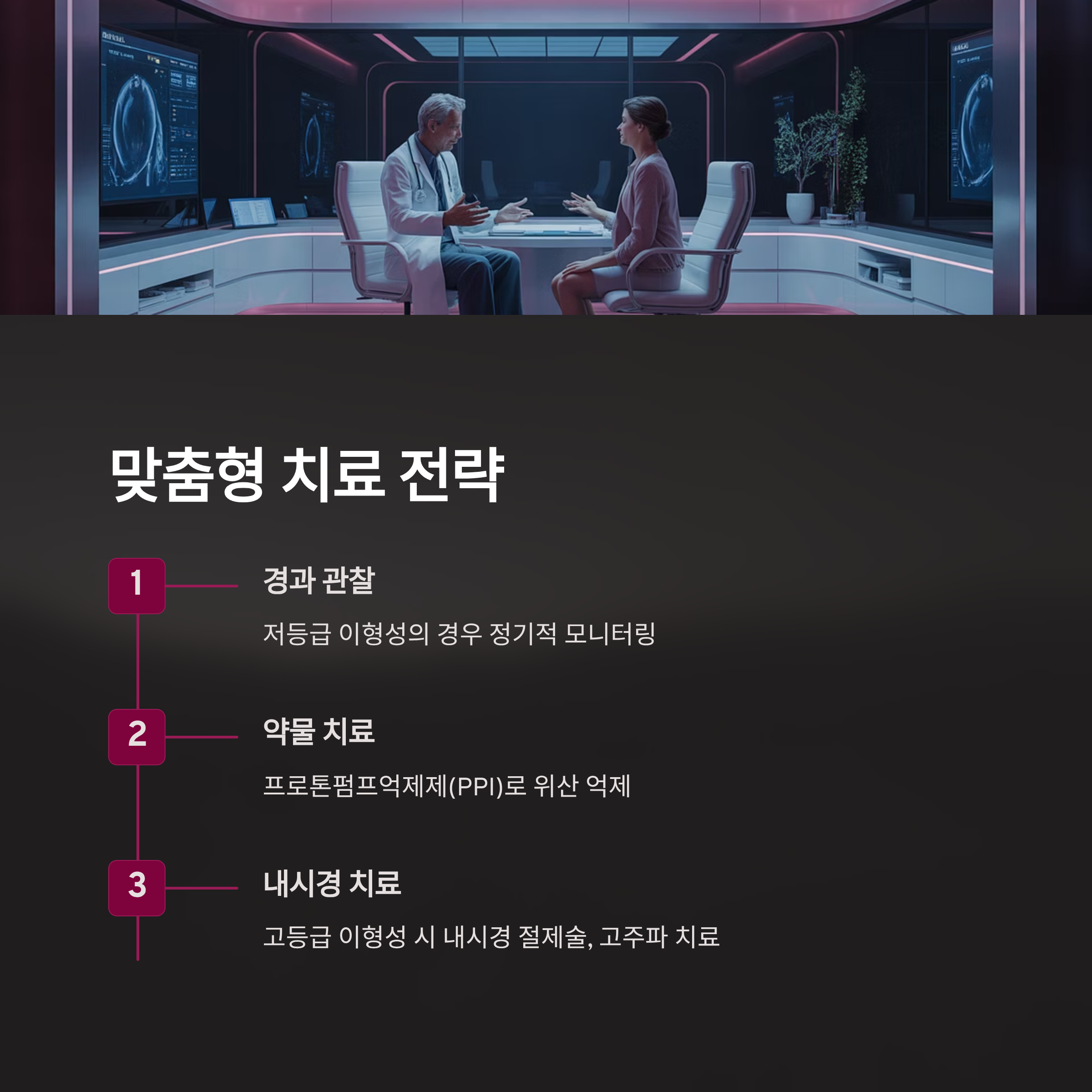 진단 결과에 따라 경과 관찰에서부터 내시경 절제술, 고주파 치료까지 다양한 치료 옵션이 존재합니다.