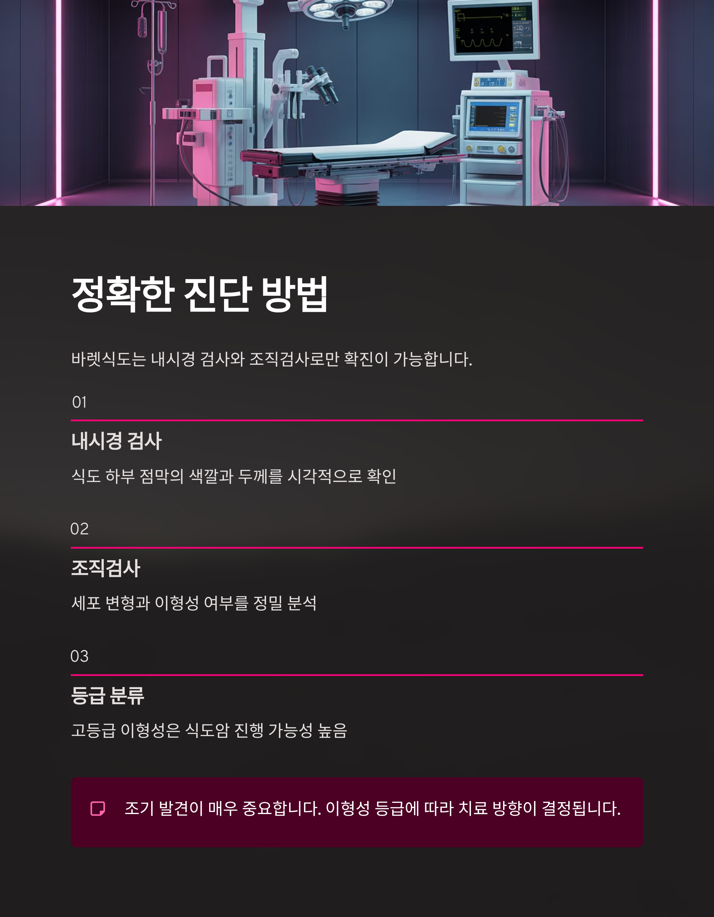이러한 세포 변화는 전암성 병변으로 간주되며, 방치할 경우 식도 선암으로 진행될 위험이 있습니다.