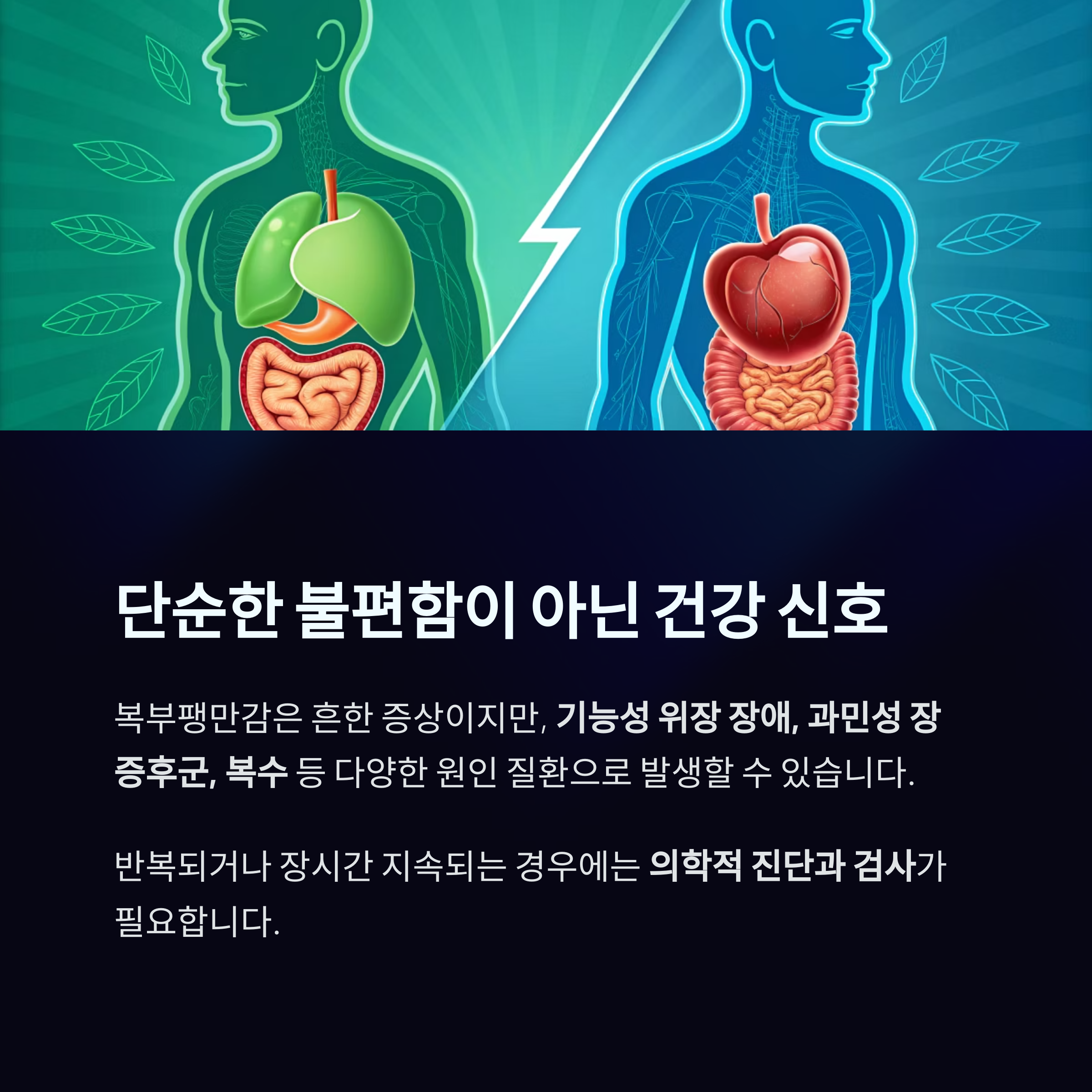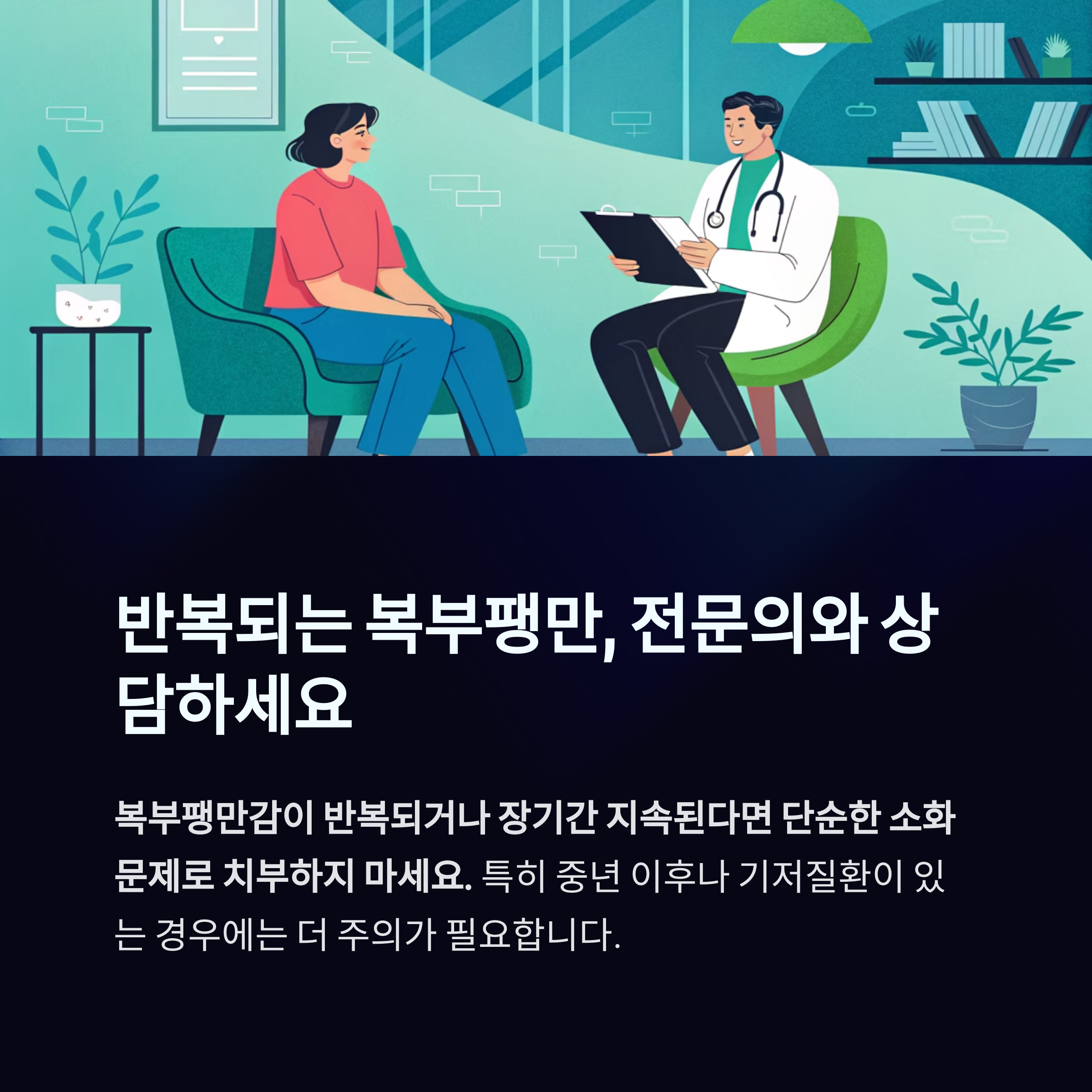 복부팽만감이 반복되거나 장기간 지속된다면 단순한 소화문제로 치부하지 마시고, 반드시 의료진의 진단과 검사를 받아야 합니다.