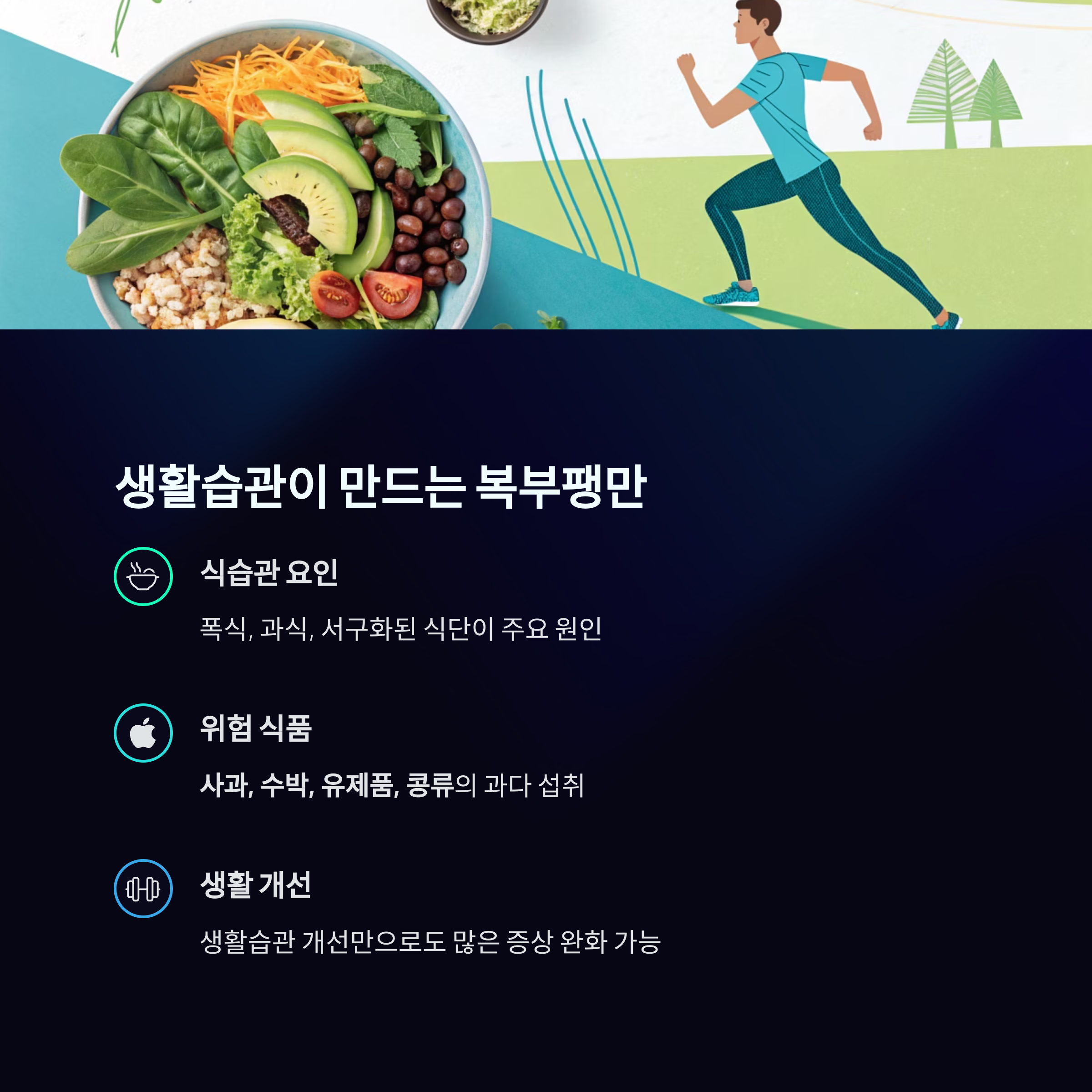 폭식, 과식, 서구화된 식단, 운동 부족, 비만 등은 복부팽만을 유발하는 대표적인 요인입니다.