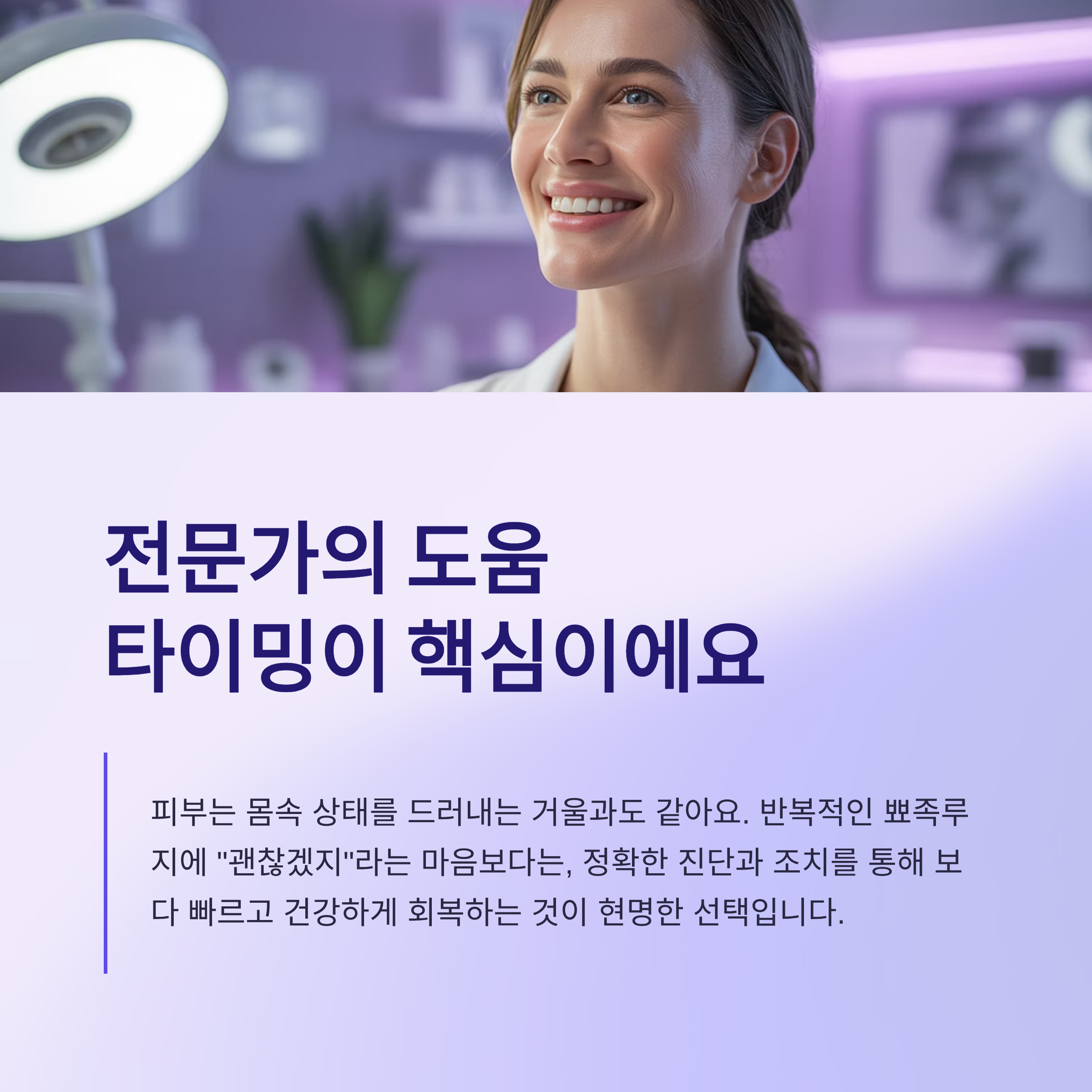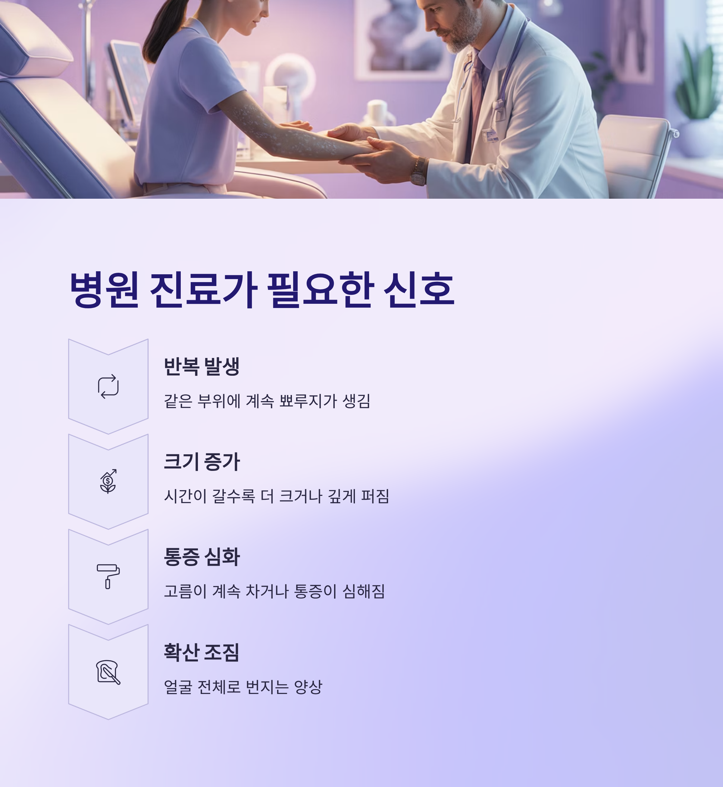 반복적으로 같은 부위에 뾰루지가 생기고, 시간이 갈수록 더 크거나 깊게 퍼지는 양상이 보인다면 반드시 전문의의 진단이 필요합니다.