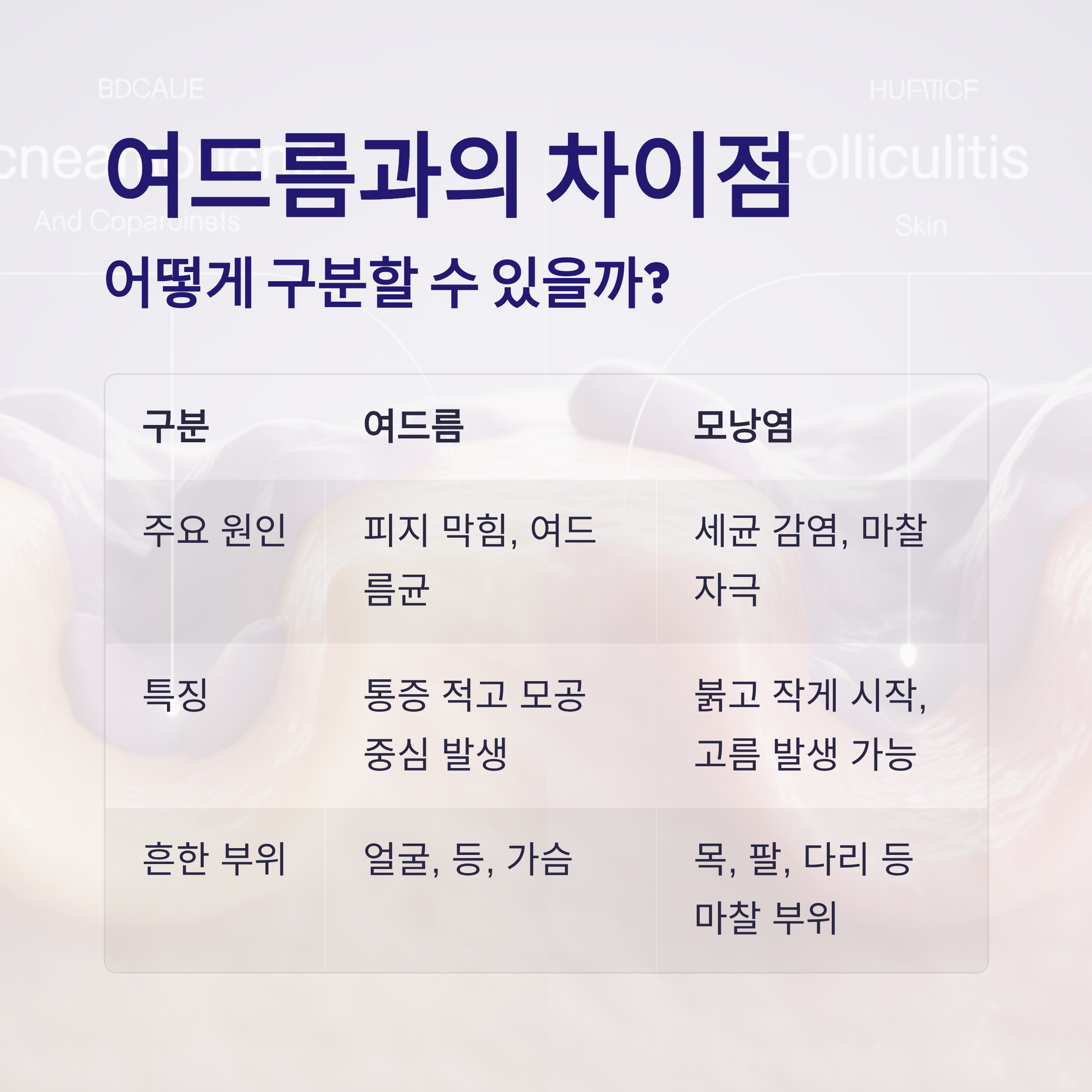 특징 통증 적고 모공 중심 발생 붉고 작게 시작되며 고름 발생 가능