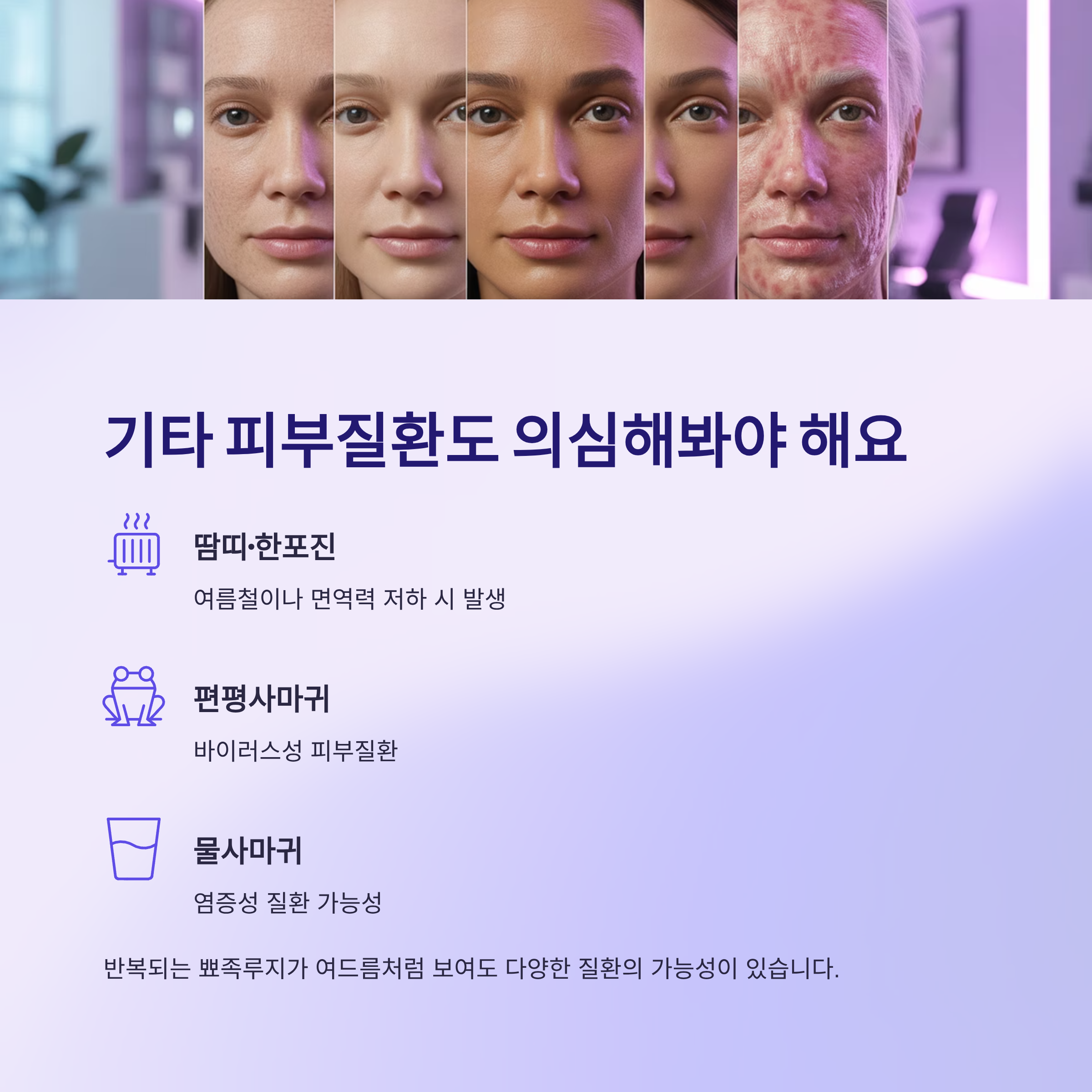 반복되는 뾰족루지가 여드름처럼 보여도, 땀띠나 한포진, 편평사마귀, 물사마귀 등 다양한 바이러스성 또는 기타 염증성 질환의 가능성도 있습니다. 특히 여름철이나 면역력이 떨어졌을 때 자주 발생합니다.