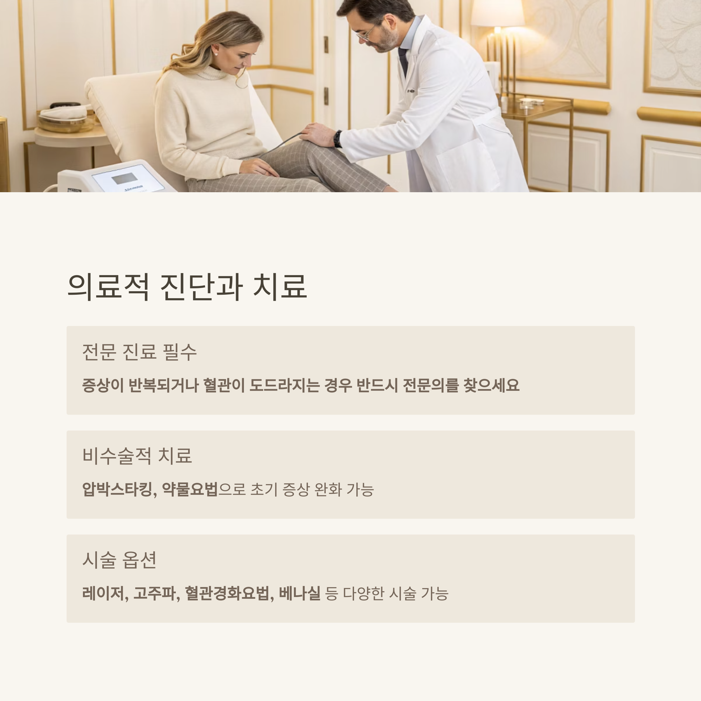 증상이 반복되거나 혈관이 도드라지는 경우에는 반드시 전문 진료가 필요합니다