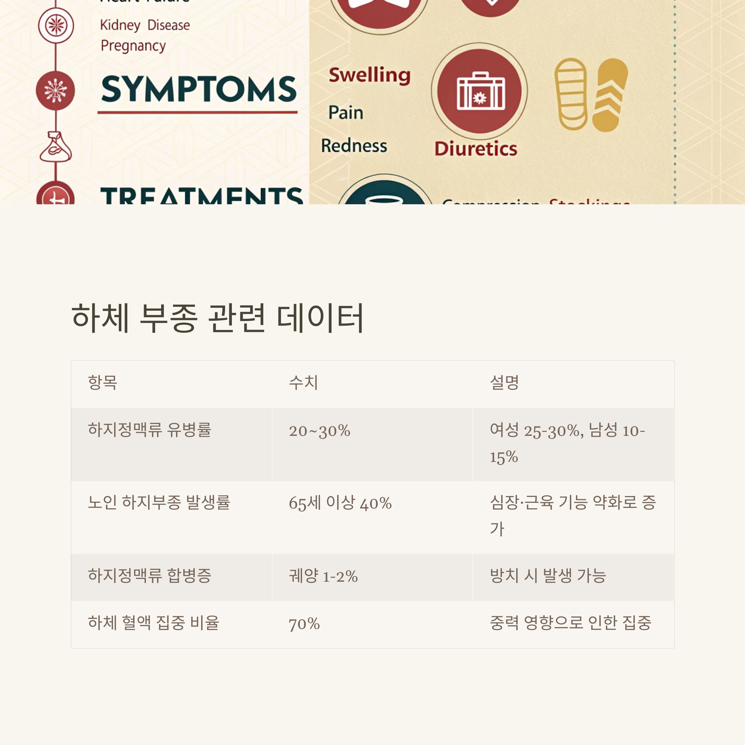 | 하체 혈액 집중 비율 | 70% | 중력 영향 및 근육 약화 시 부종 악화 |