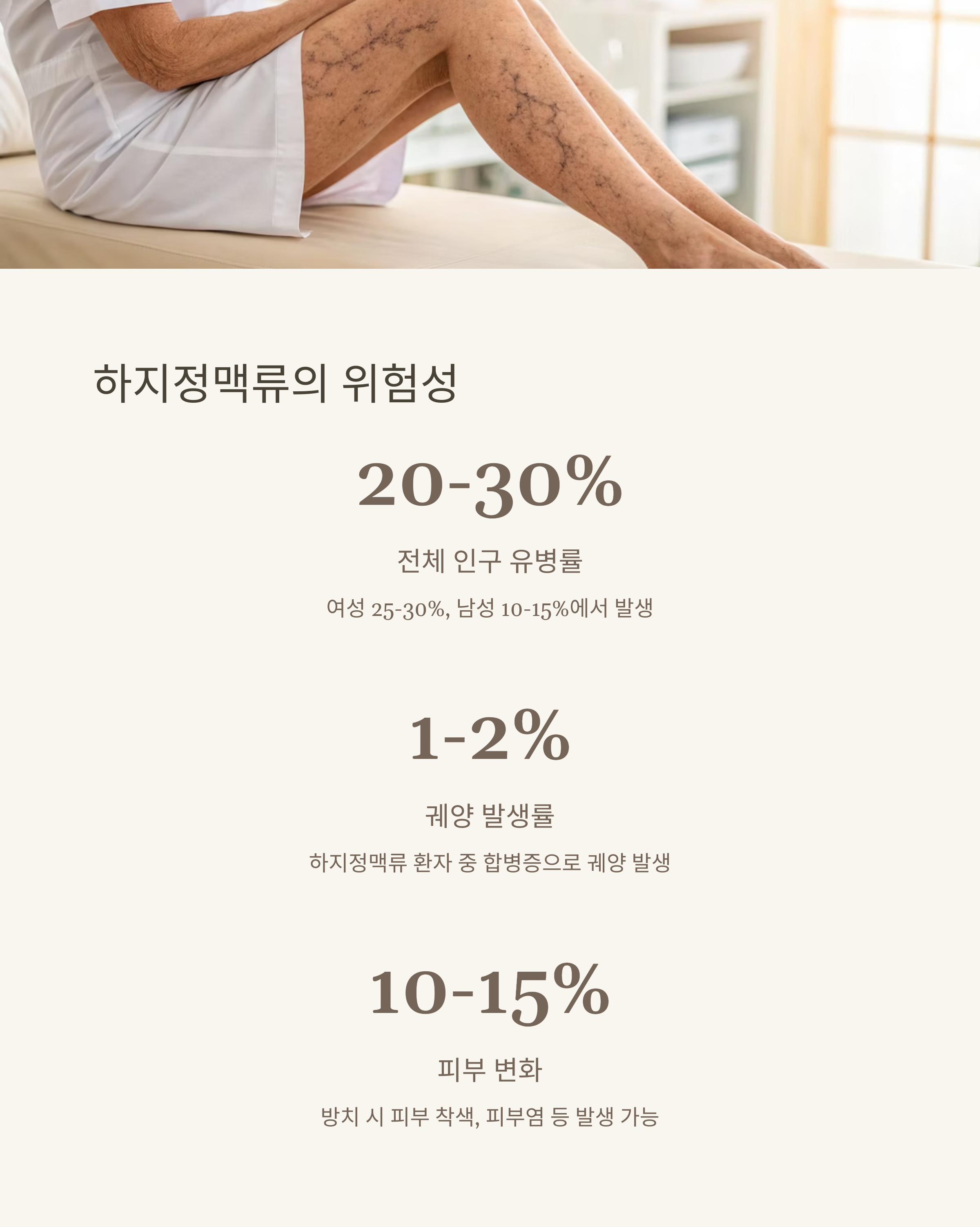 | 하지정맥류 합병증 | 궤양12%, 피부 변화 10% 에서 15% | 방치 시 발생 가능 |