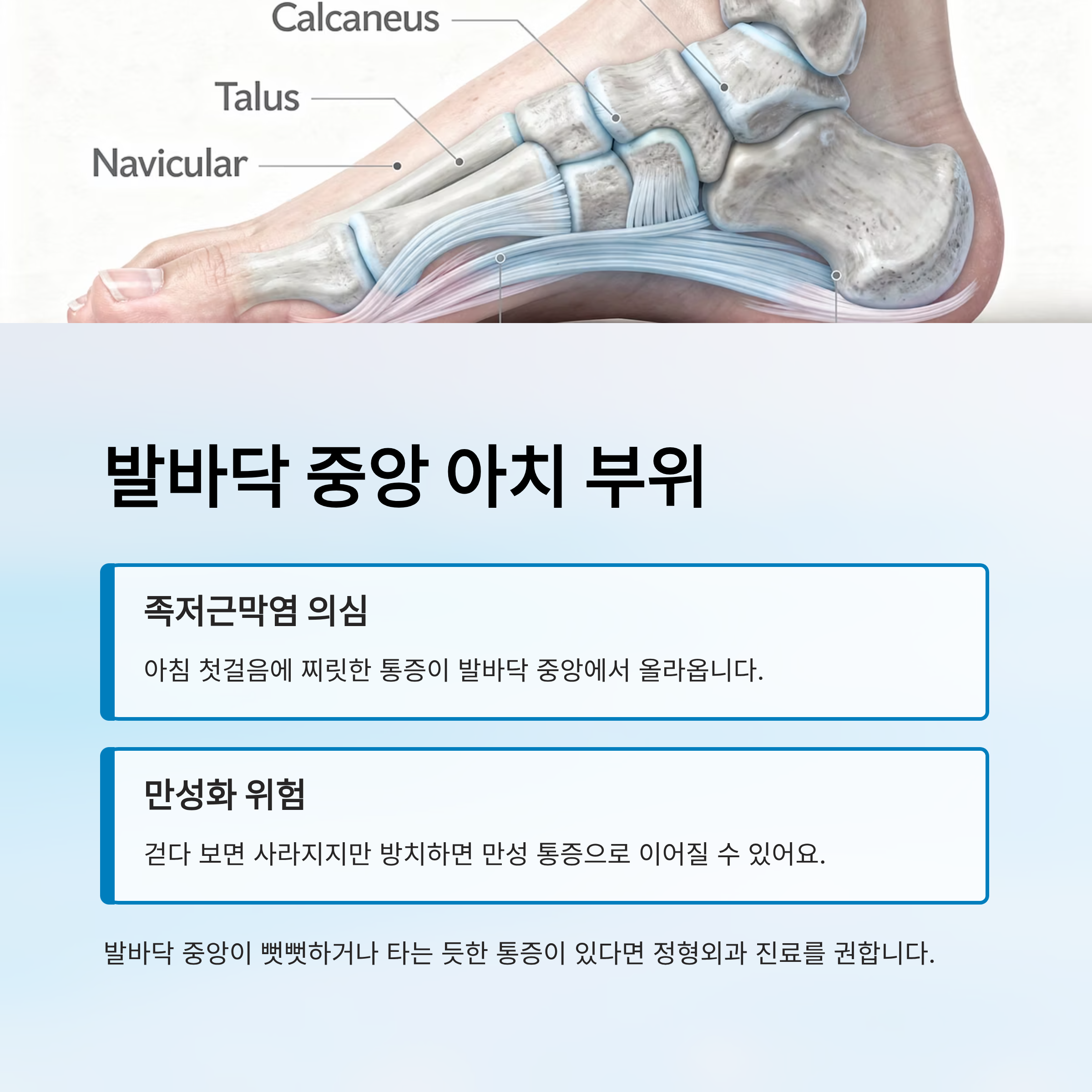 특히 발바닥 중앙이 뻣뻣하거나 타는 듯한 통증이 있다면,