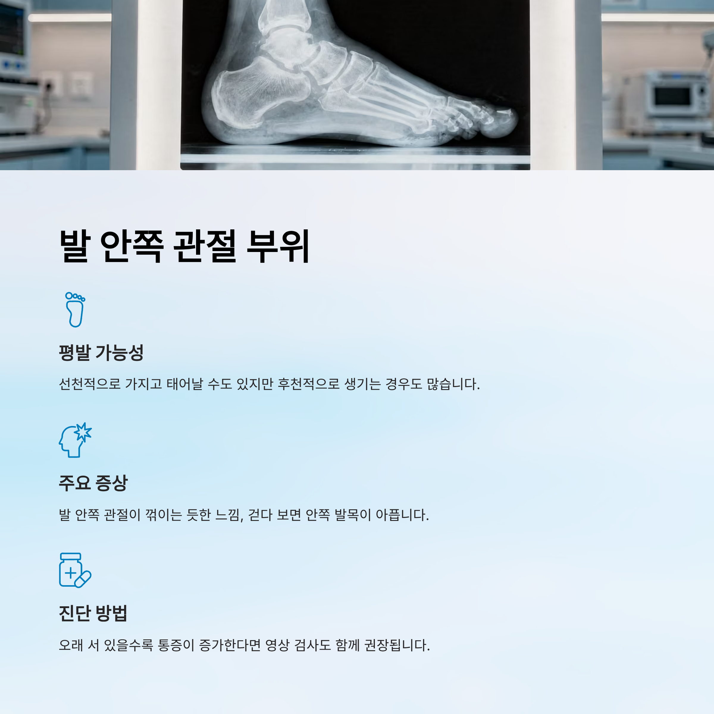 | 발 안쪽 관절 | 평발·변형 | 높음 |