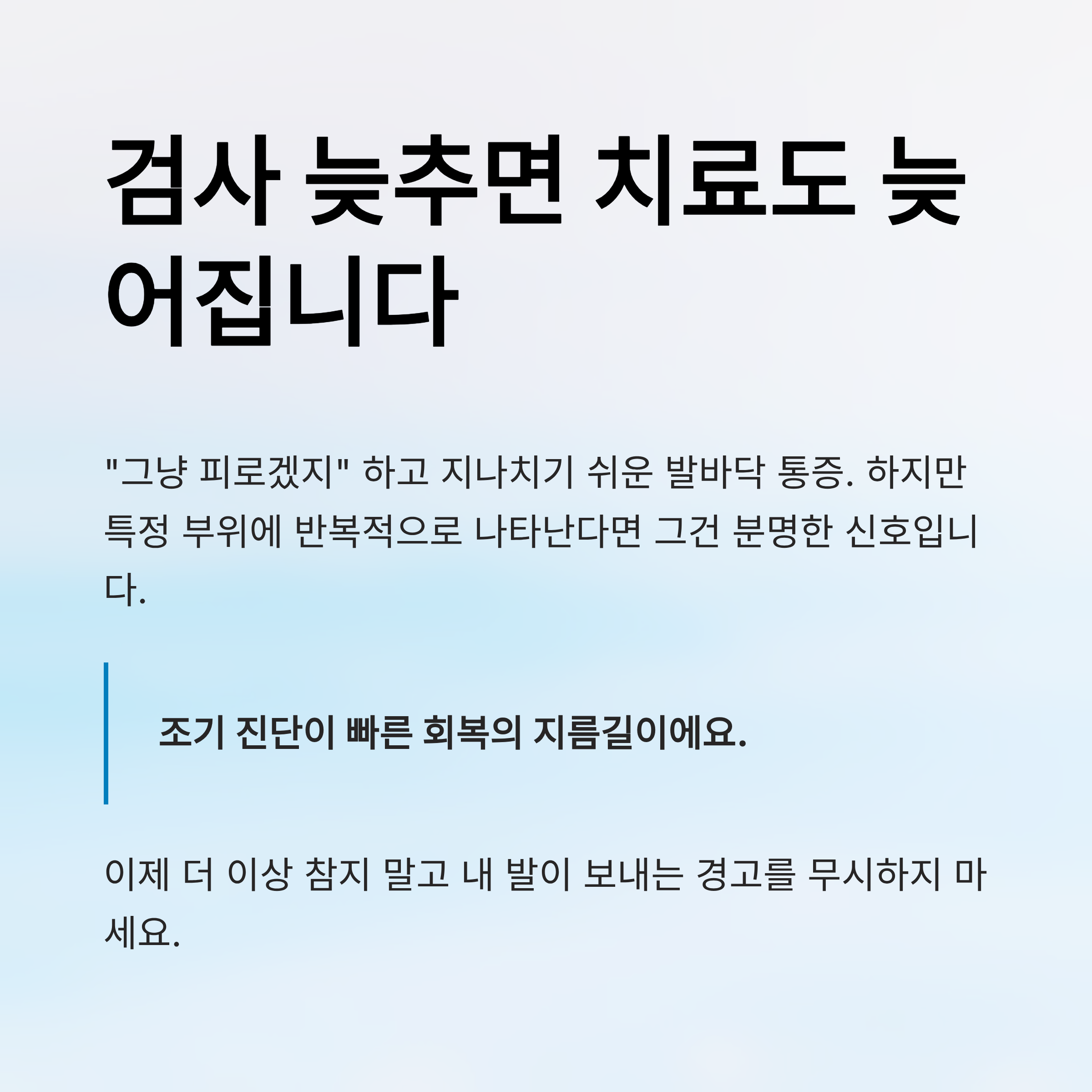 발바닥이 찌릿하거나, 딛기만 해도 통증이 느껴지신다면 그냥 넘기지 마세요. 특히 특정 부위에 통증이 집중된다면, 단순한 피로가 아니라 신경 압박이나 염증성 질환일 가능성도 있습니다. 오늘은 검사를 꼭 받아야 할 발바닥 통증 부위를 중심으로 알려드릴게요.