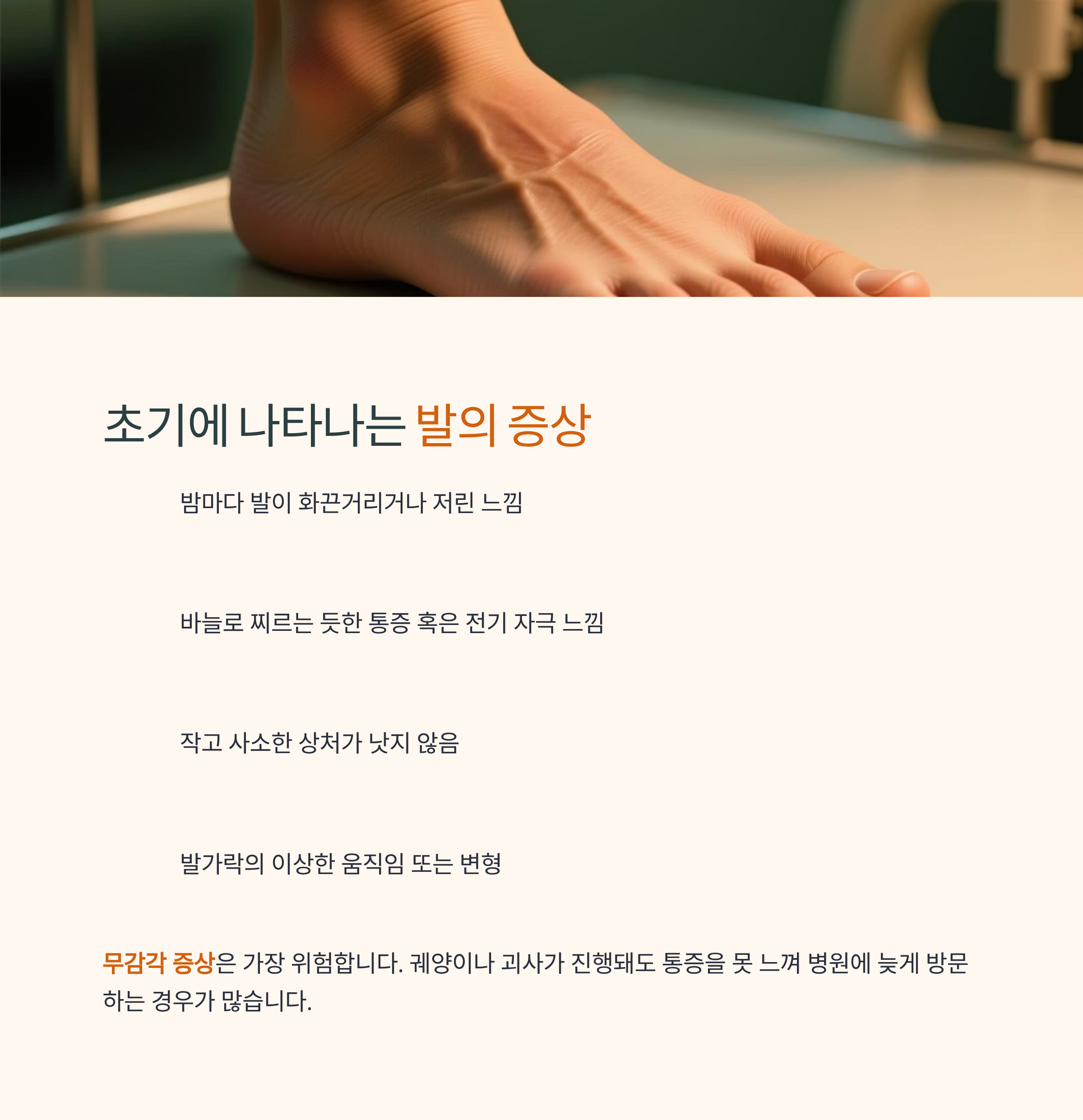이 중에서도 무감각 증상은 가장 위험합니다. 궤양이나 괴사가 진행돼도 통증을 못 느껴 병원에 늦게 방문하는 경우가 많기 때문입니다.