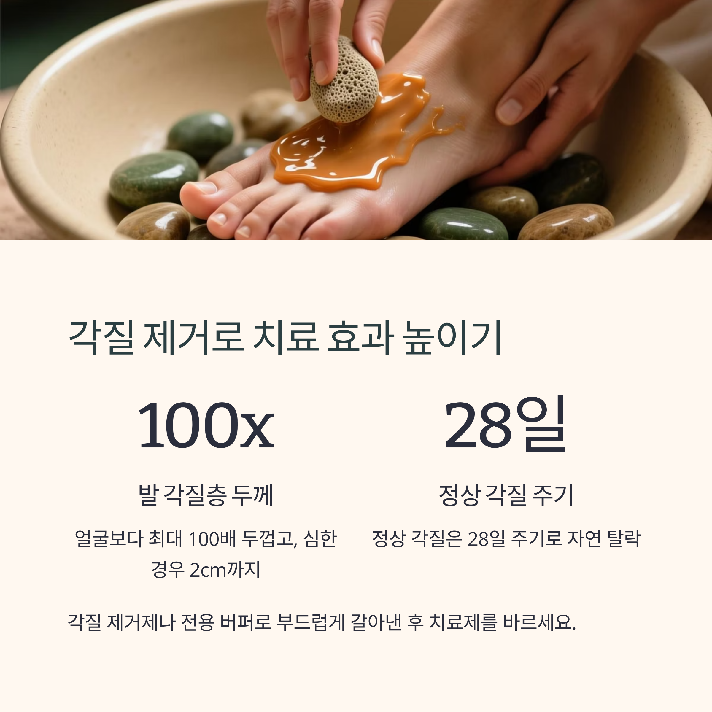 발 각질층은 얼굴보다 최대 100배 두껍고, 심한 경우 2cm까지 두꺼워질 수 있습니다. 항진균제 흡수율을 높이려면 필요 이상 두꺼운 각질을 제거해야 합니다. 각질 제거제를 활용하거나 전용 버퍼로 부드럽게 갈아낸 후 치료제를 바르는 방법이 좋습니다.